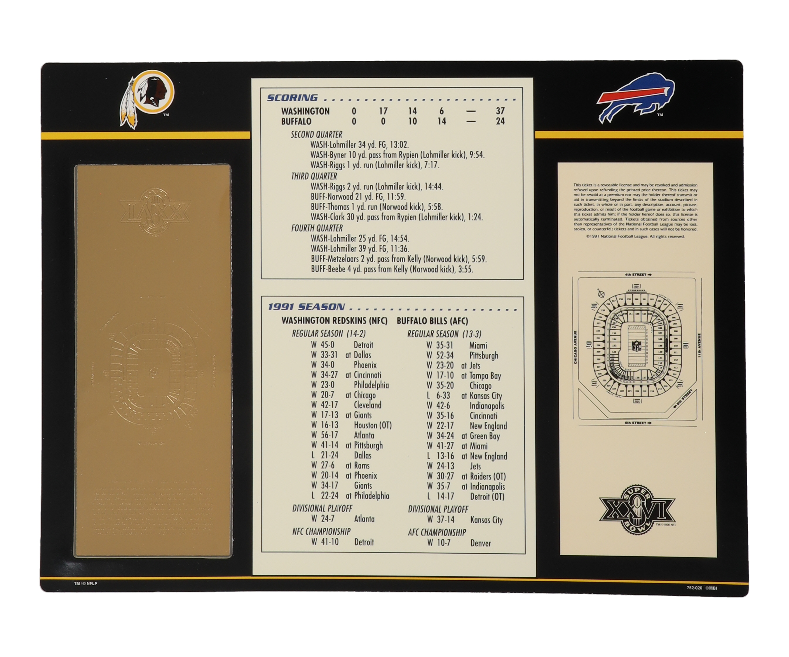 Super Bowl XXVI Commemorative 9x12 Score Card Display with 22KT Gold Ticket