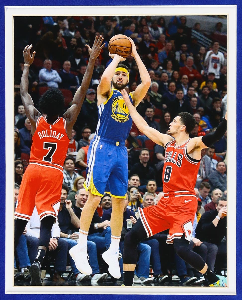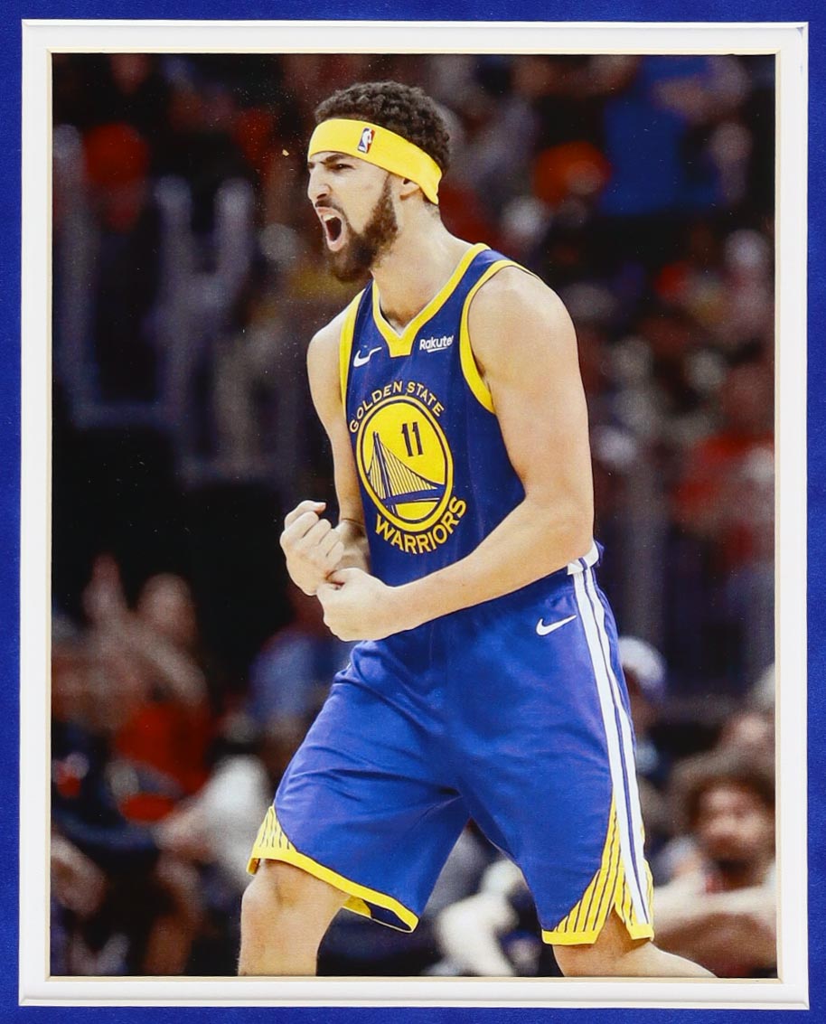 Custom frame measures approximately 35.5" x 43.5" in size and features a jersey hand-signed by Klay Thompson. Frame comes with LED strips to provide a back-lit display.