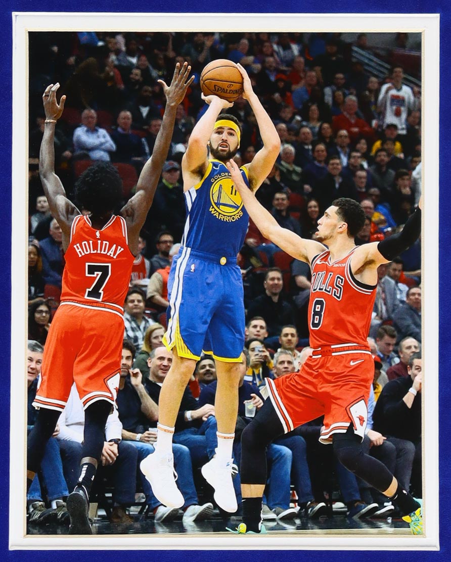 Custom frame measures approximately 35.5" x 43.5" in size and features a jersey hand-signed by Klay Thompson. Frame comes with LED strips to provide a back-lit display.