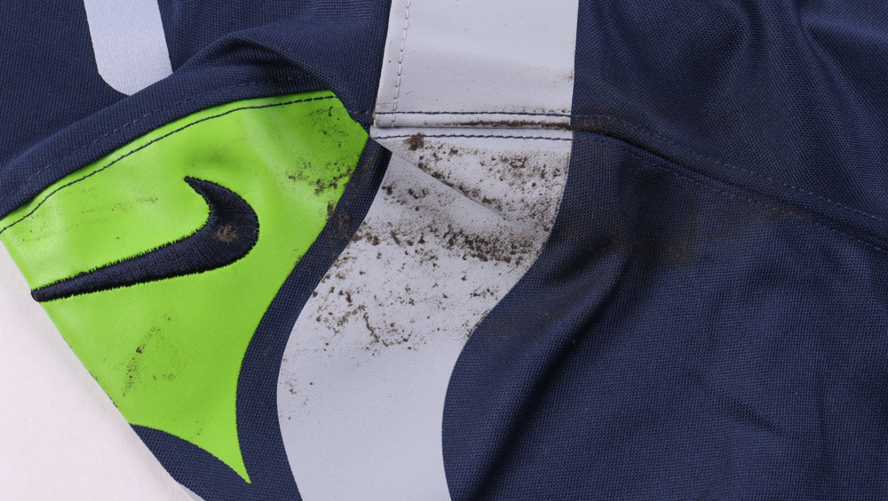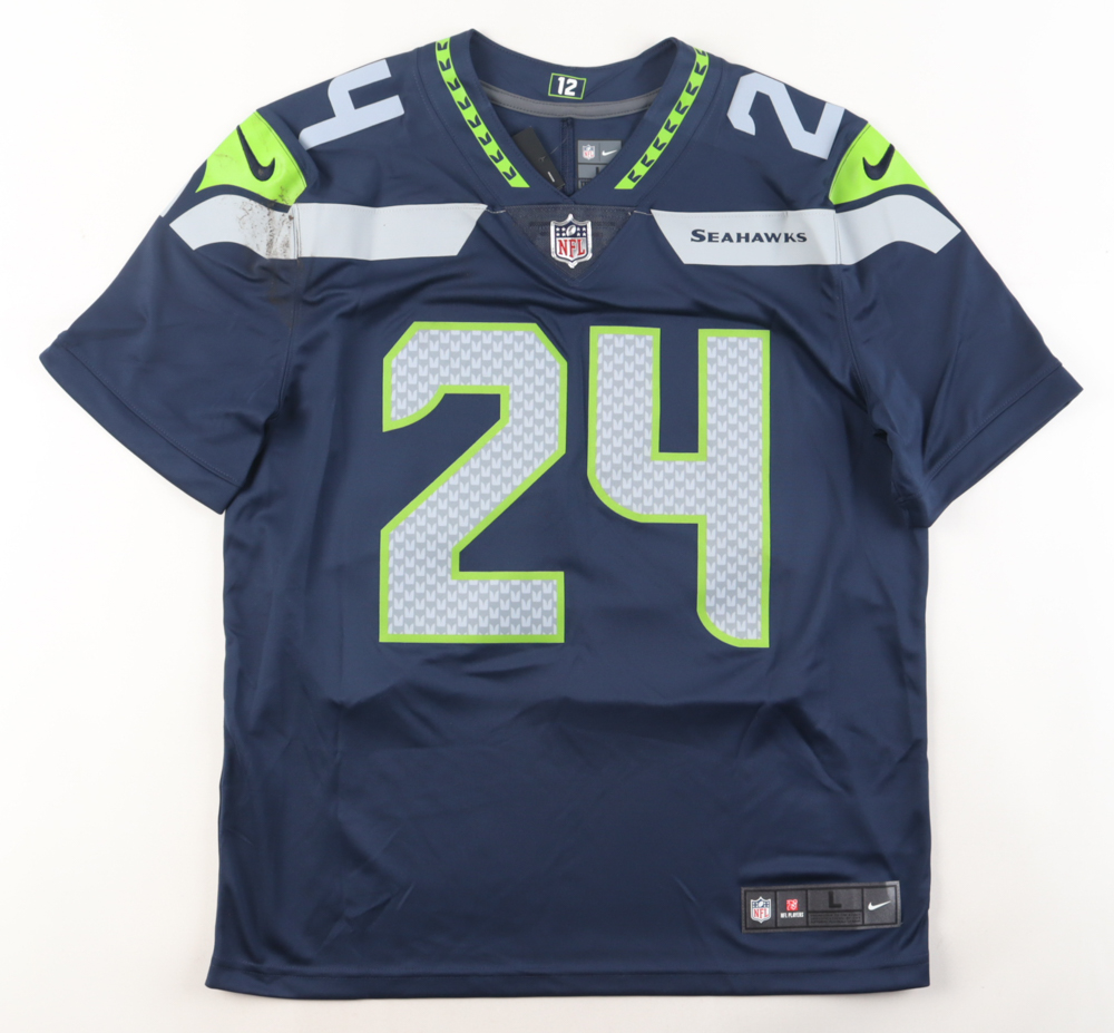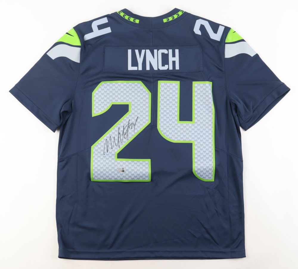Nike jersey with everything pressed on, size L. Hand-signed by Marshawn Lynch (Seattle Seahawks). Please note, there is staining on the right sleeve.