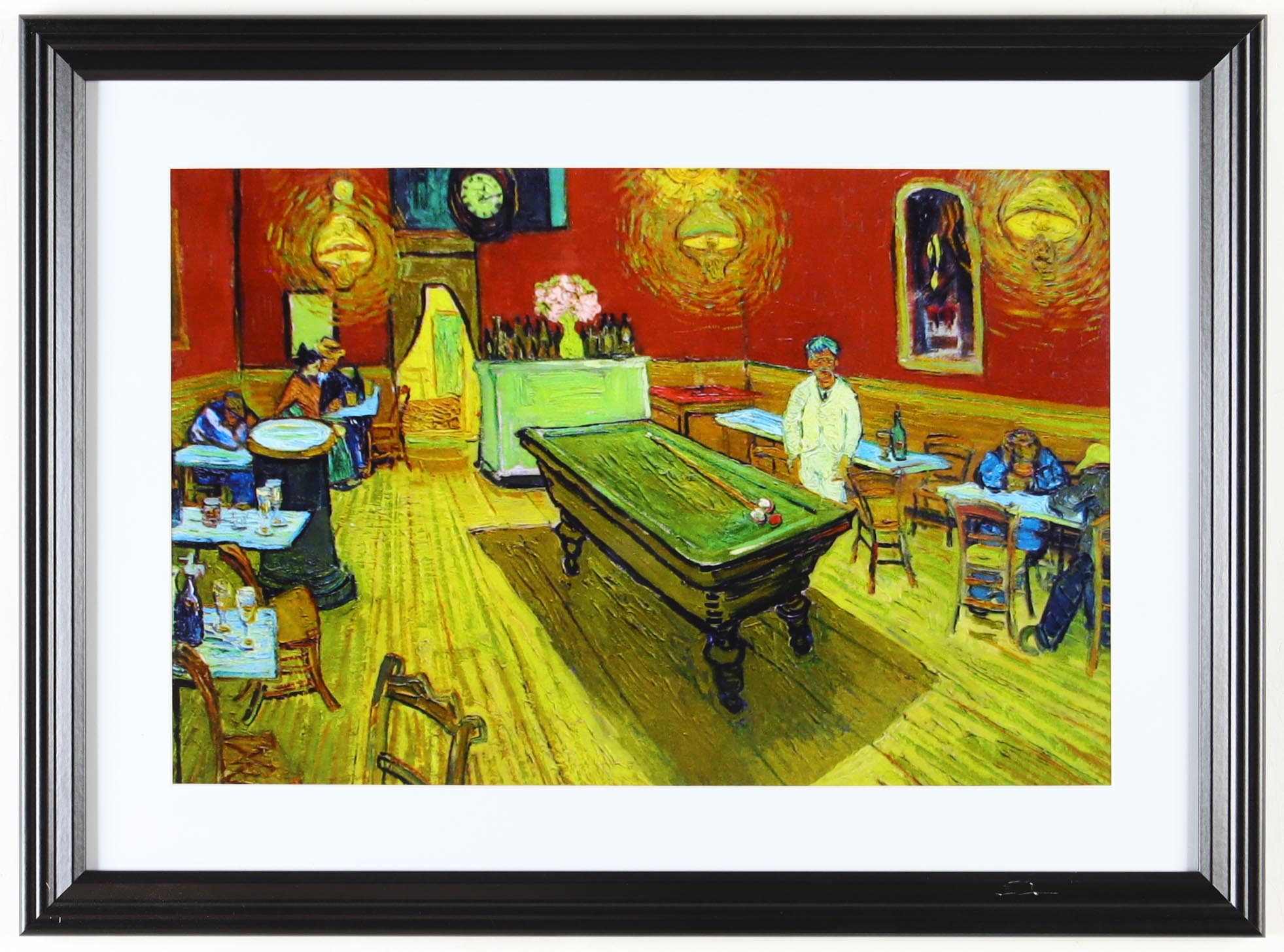Custom frame measures approximately 17" x 23" in size and features a print of Vincent van Gogh (D. 1890) painting "The Night Cafe". Please note, the display is unsigned and there are scratches on the bottom border.