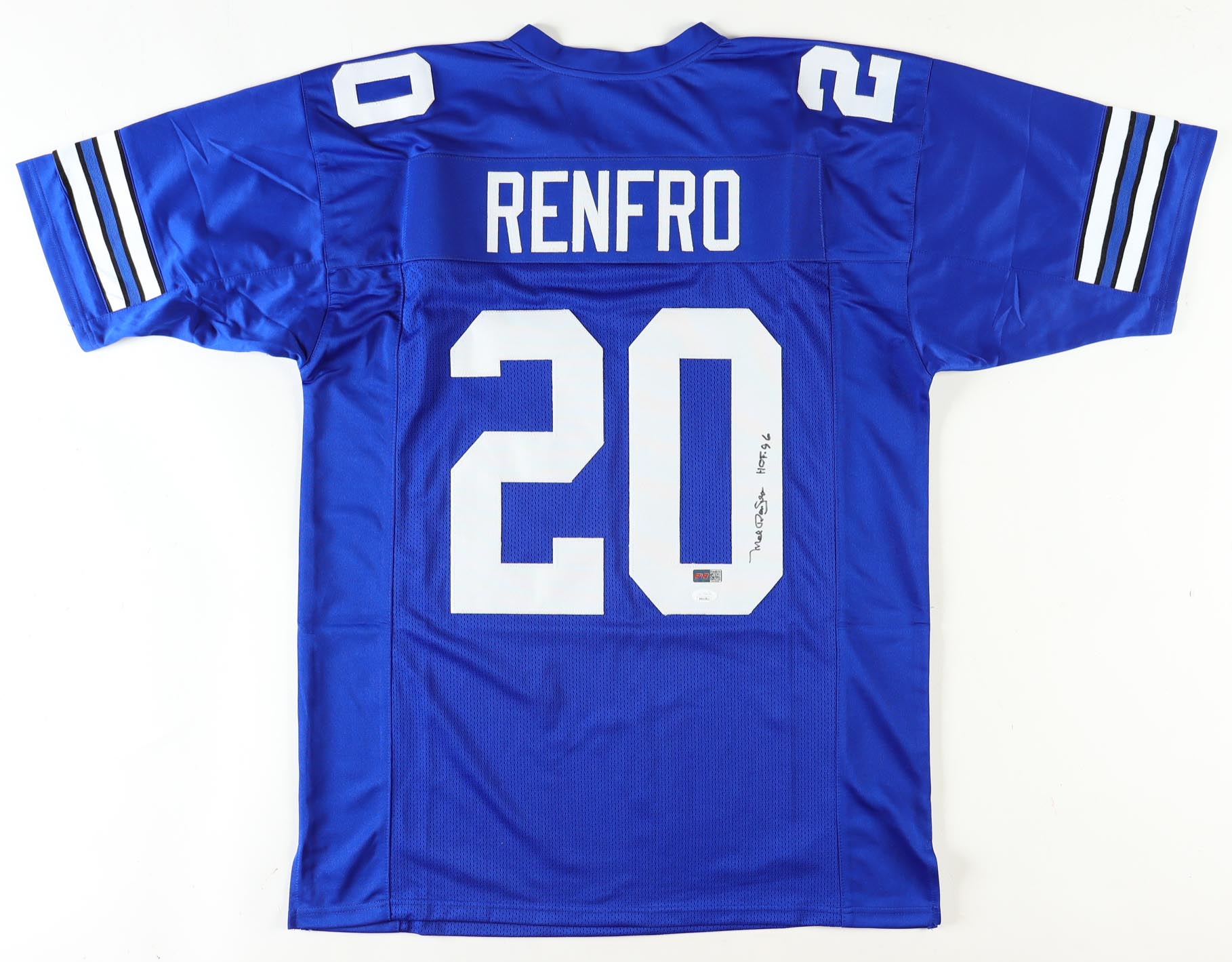 Custom jersey with everything sewn on, size XL. Hand-signed and inscribed by Mel Renfro (HOF).