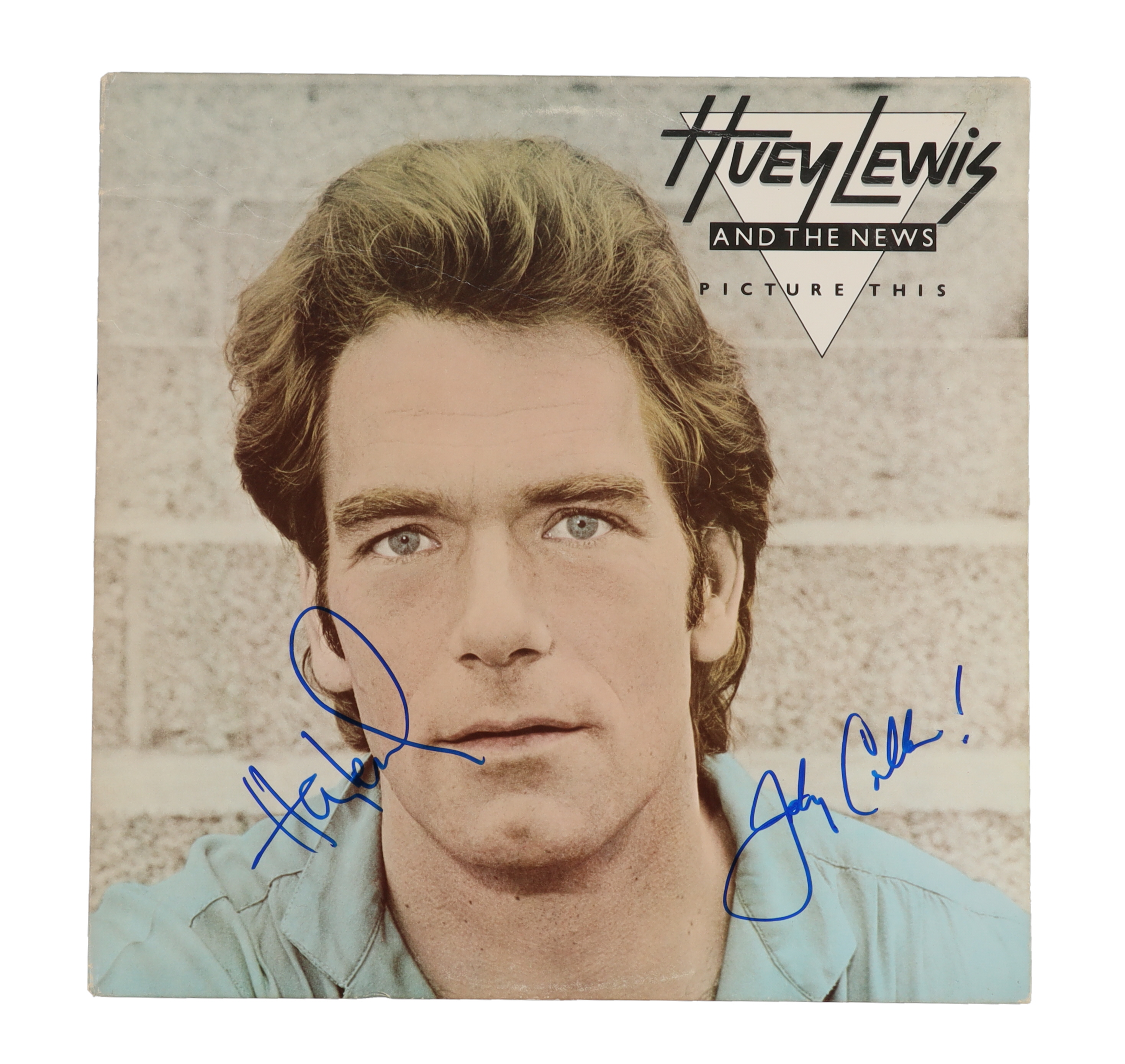 "Picture This" vinyl record album cover has been hand-signed by Huey Lewis, Johnny Colla, and Bill Gibson. Please note, the vinyl record is not included, and the cover shows signs of age and wear.