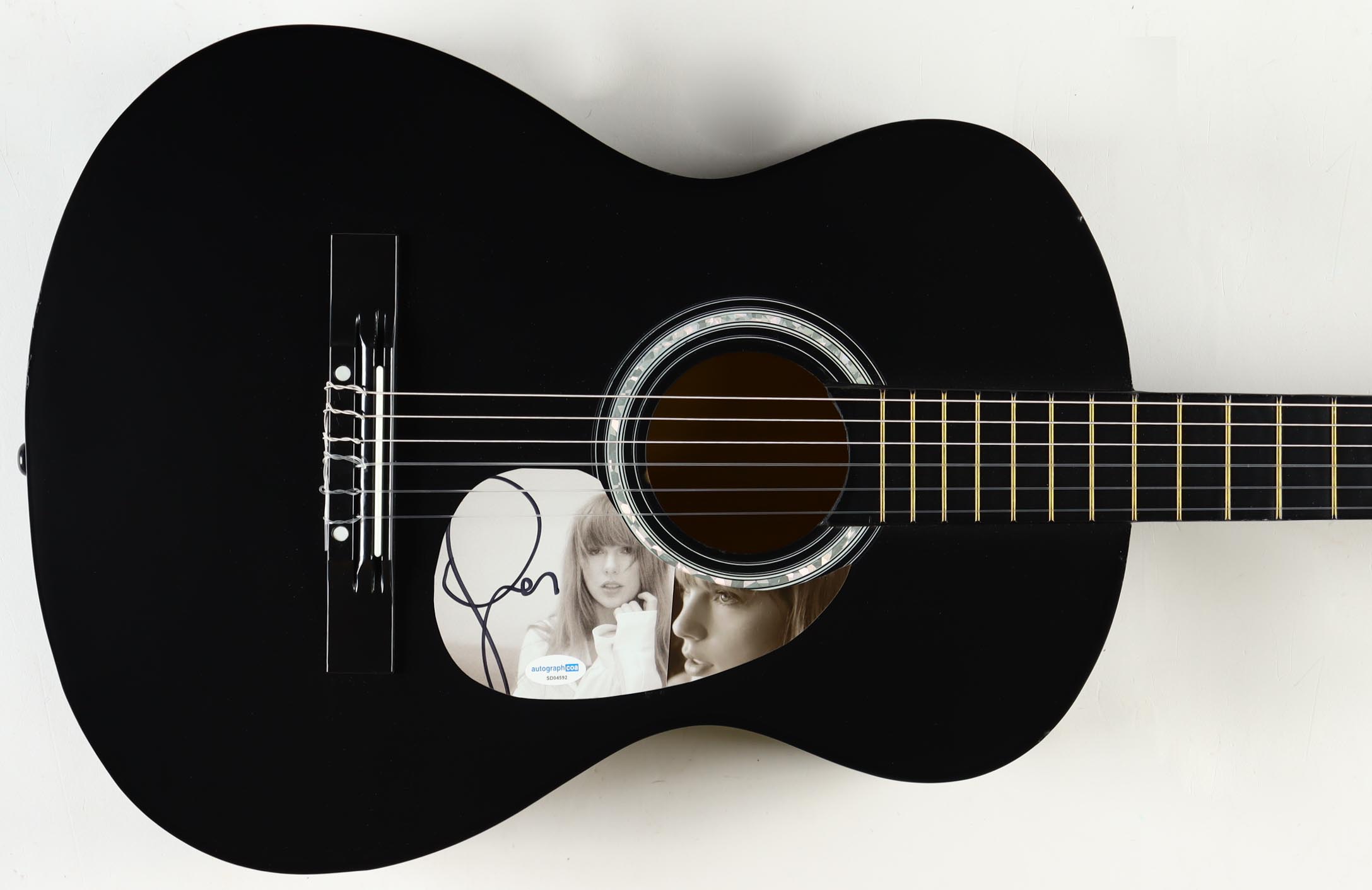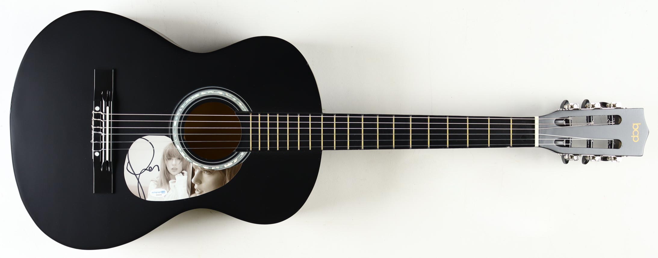 BCP Acoustic guitar measures approximately 38" in length and has been hand-signed on a CD cover that has been repurposed as a pick-guard by Taylor Swift.