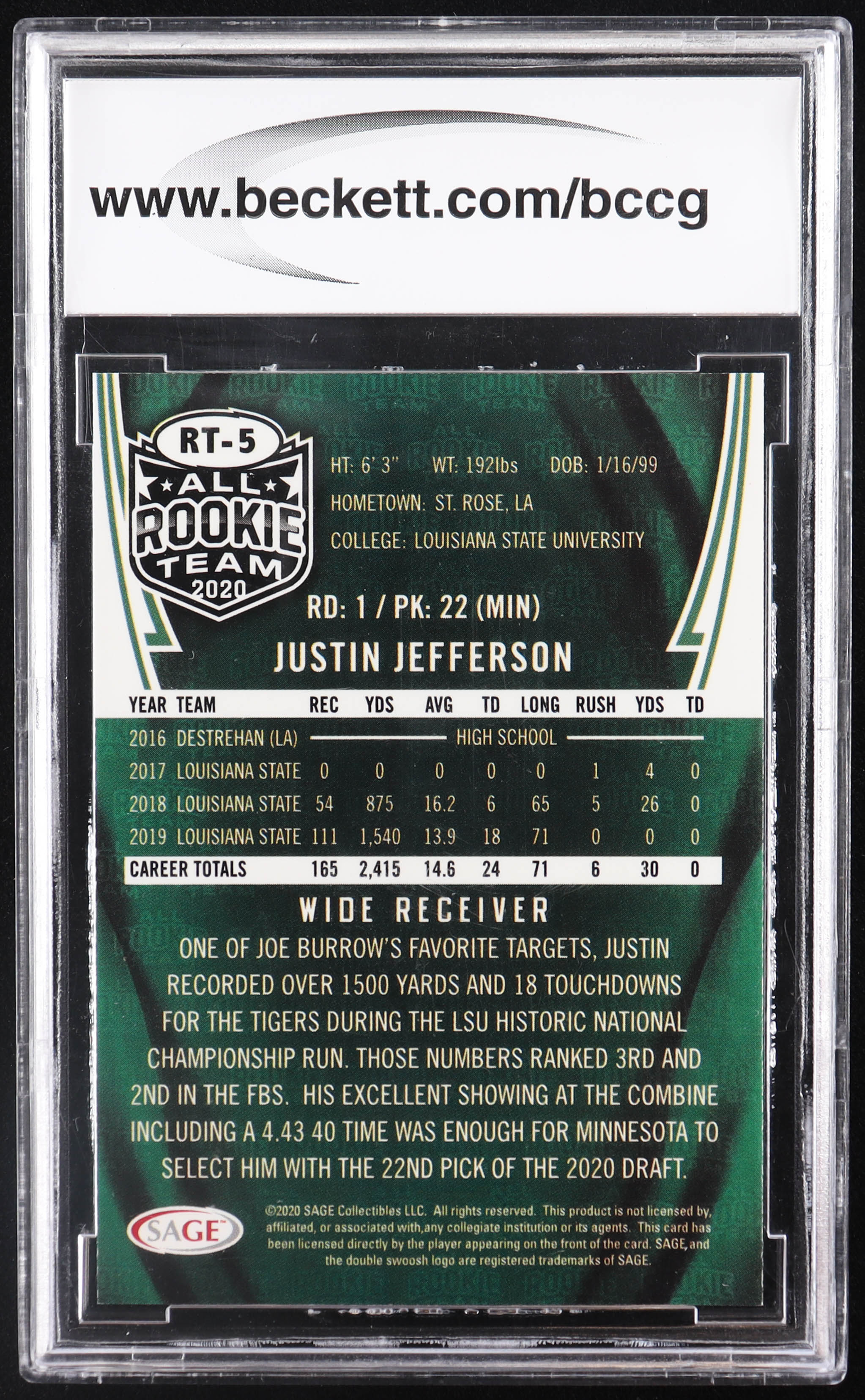 Justin Jefferson 2020 SAGE All Rookie Team Gold #RT5 RC (BCCG 10)