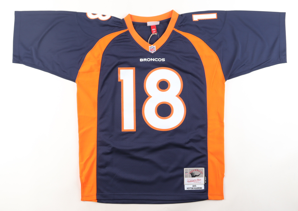 Mitchell & Ness jersey. Everything sewn on, size 44 (L). Hand-signed by Peyton Manning (Denver Broncos, HOF).