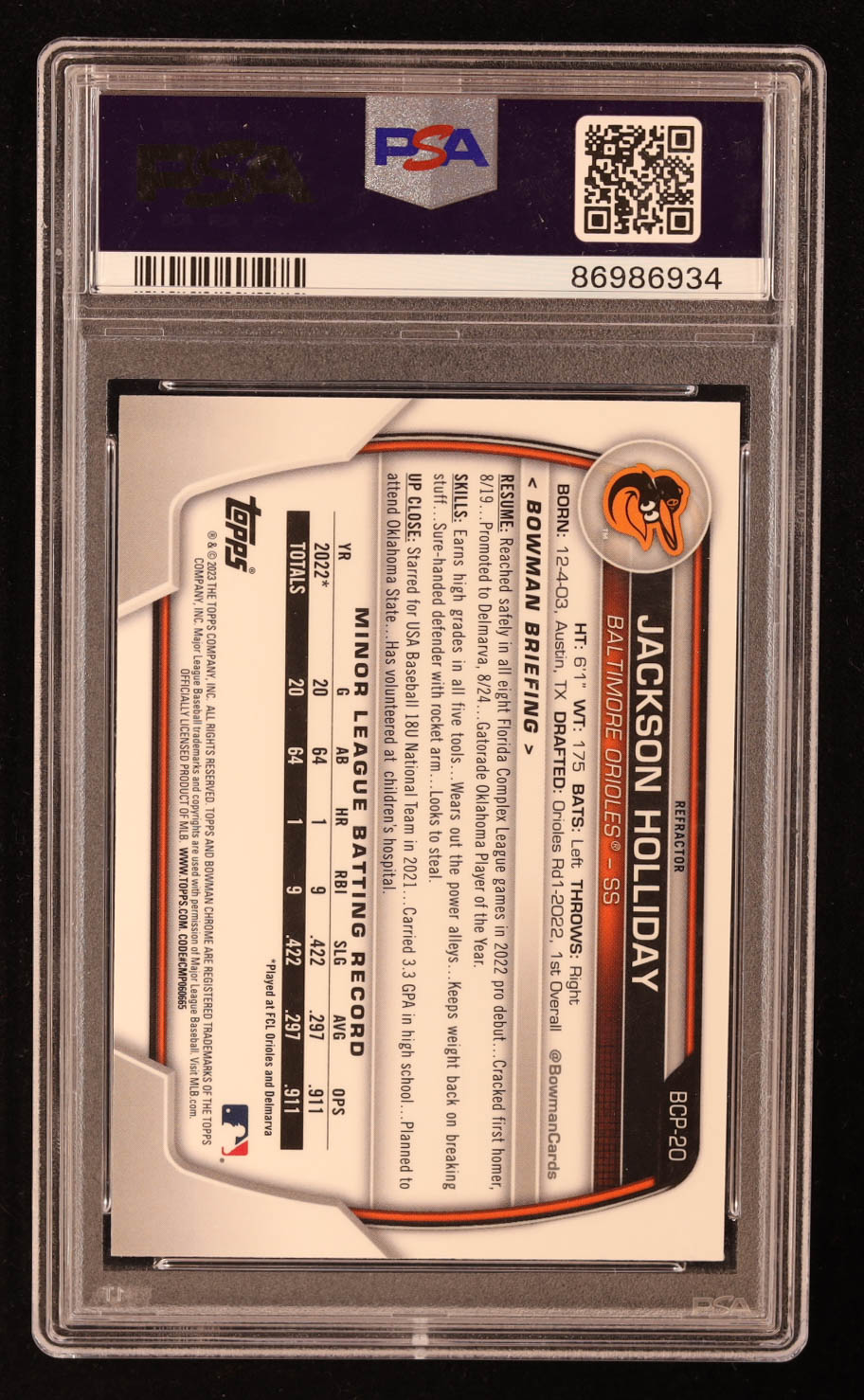 Jackson Holliday 2023 Bowman Chrome Prospects Lunar Glow Refractors #BCP20 RC (PSA 10)