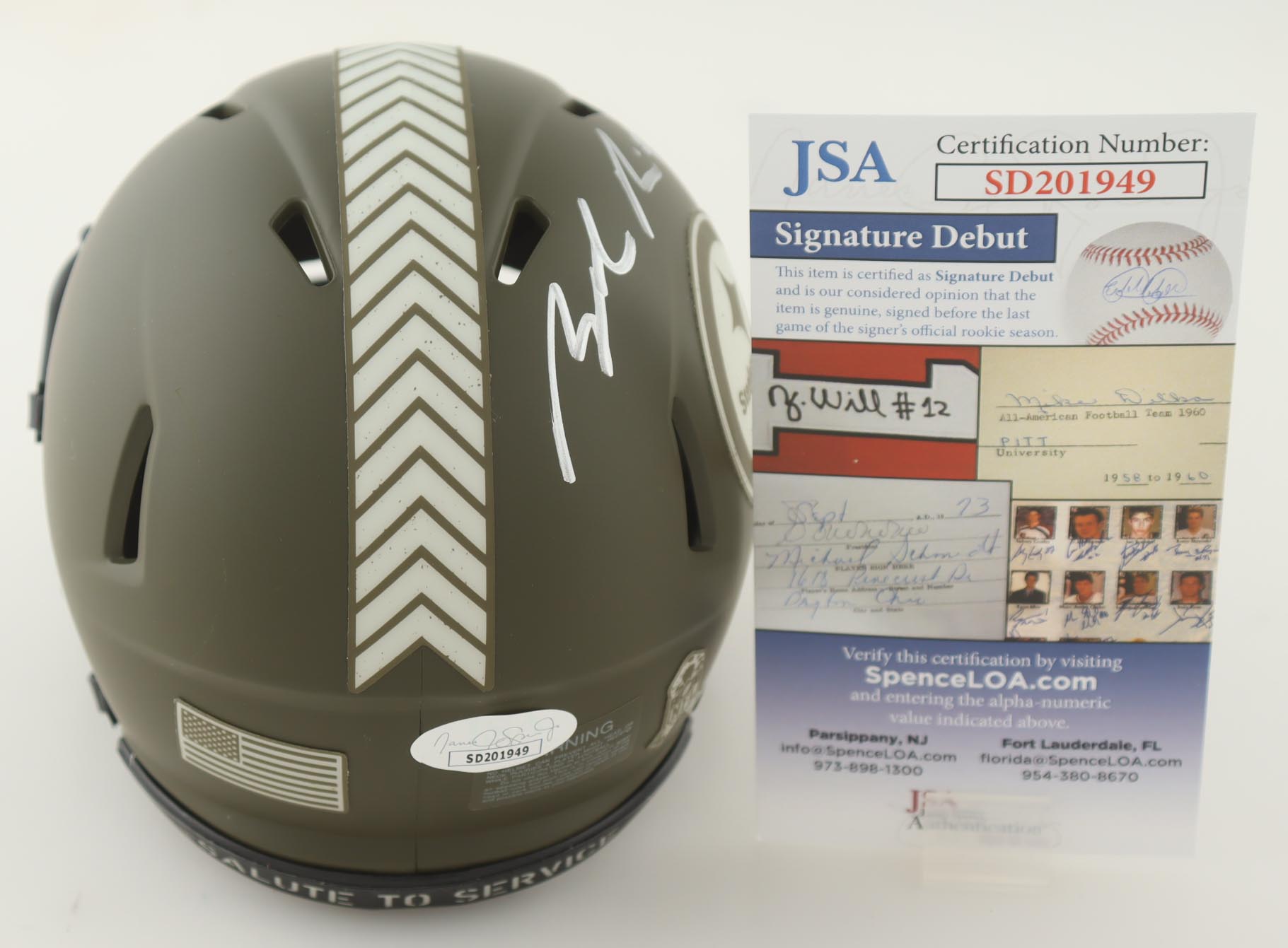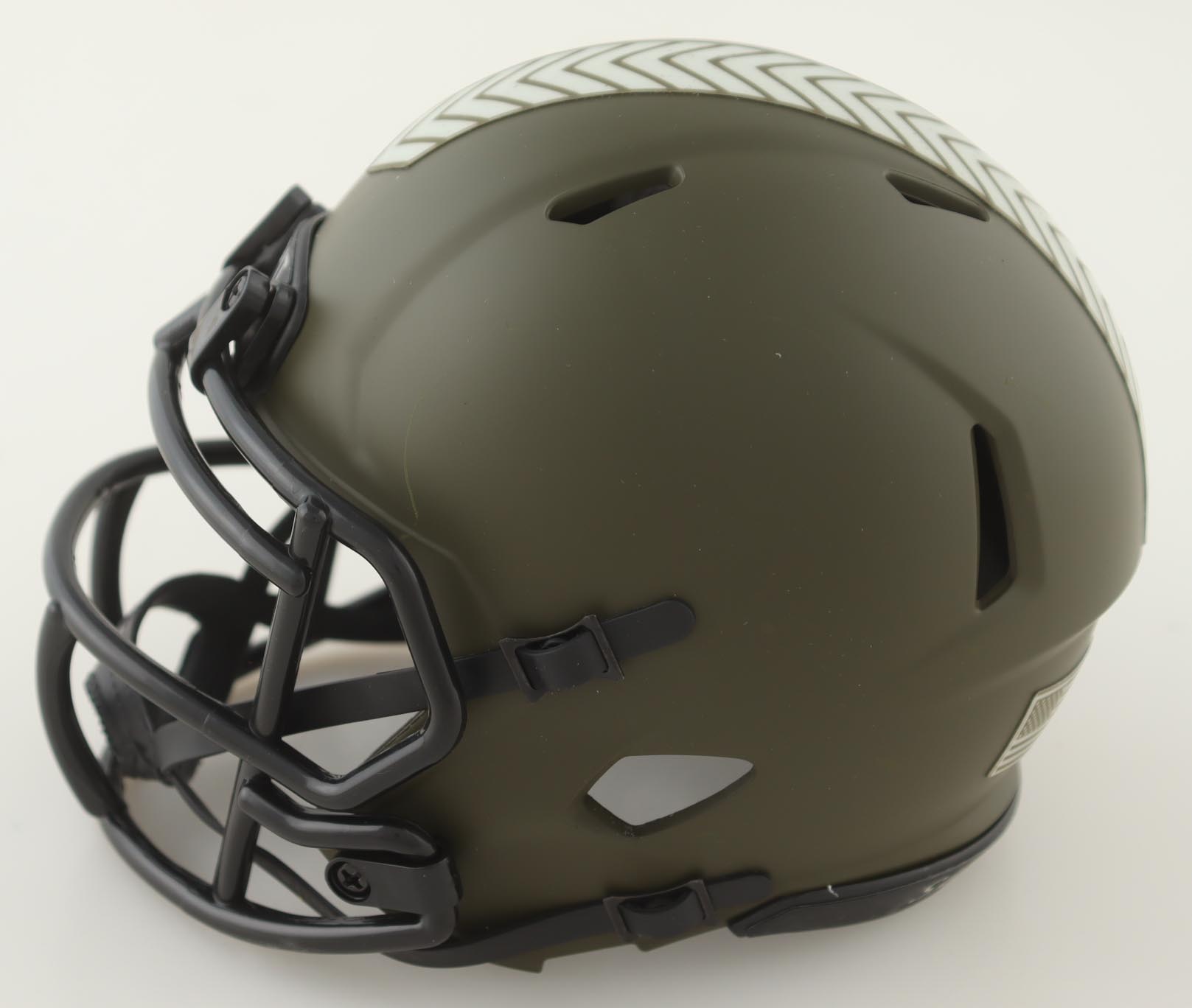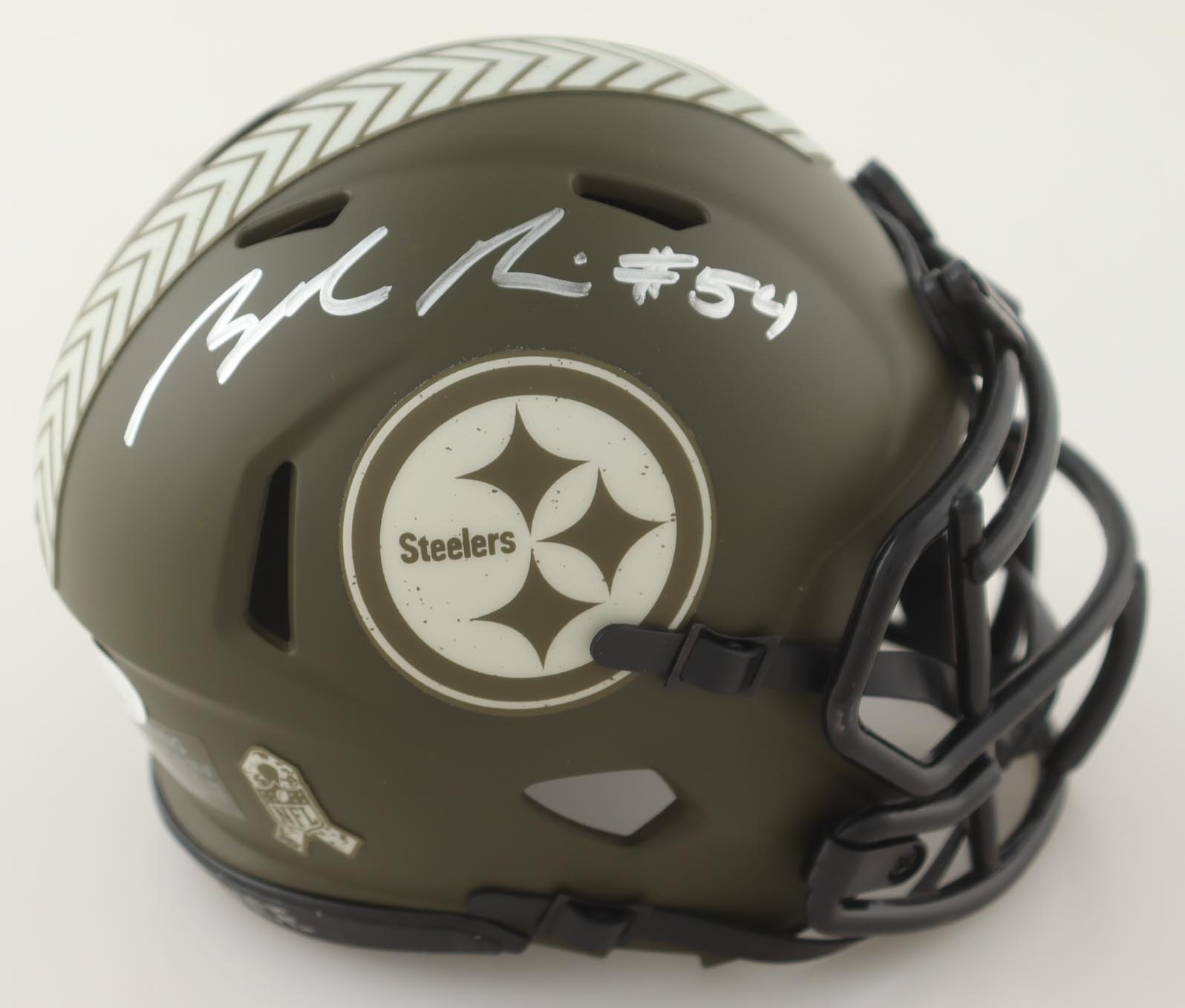 Riddell Pittsburgh Steelers Salute To Service Alternate speed mini helmet has been hand-signed by Zach Frazier.