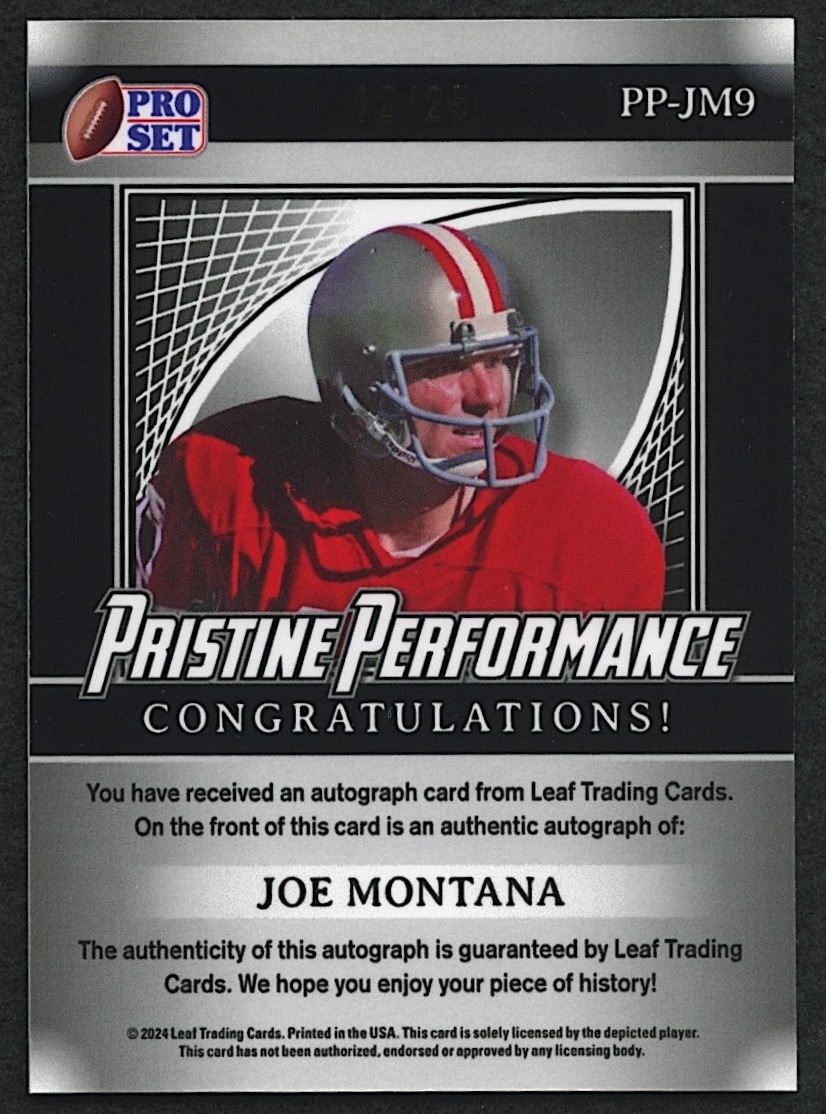 Joe Montana 2024 Leaf Legacy Collection "Pristine Performance" #PP-JM9 Autograph SP Variation #12/25