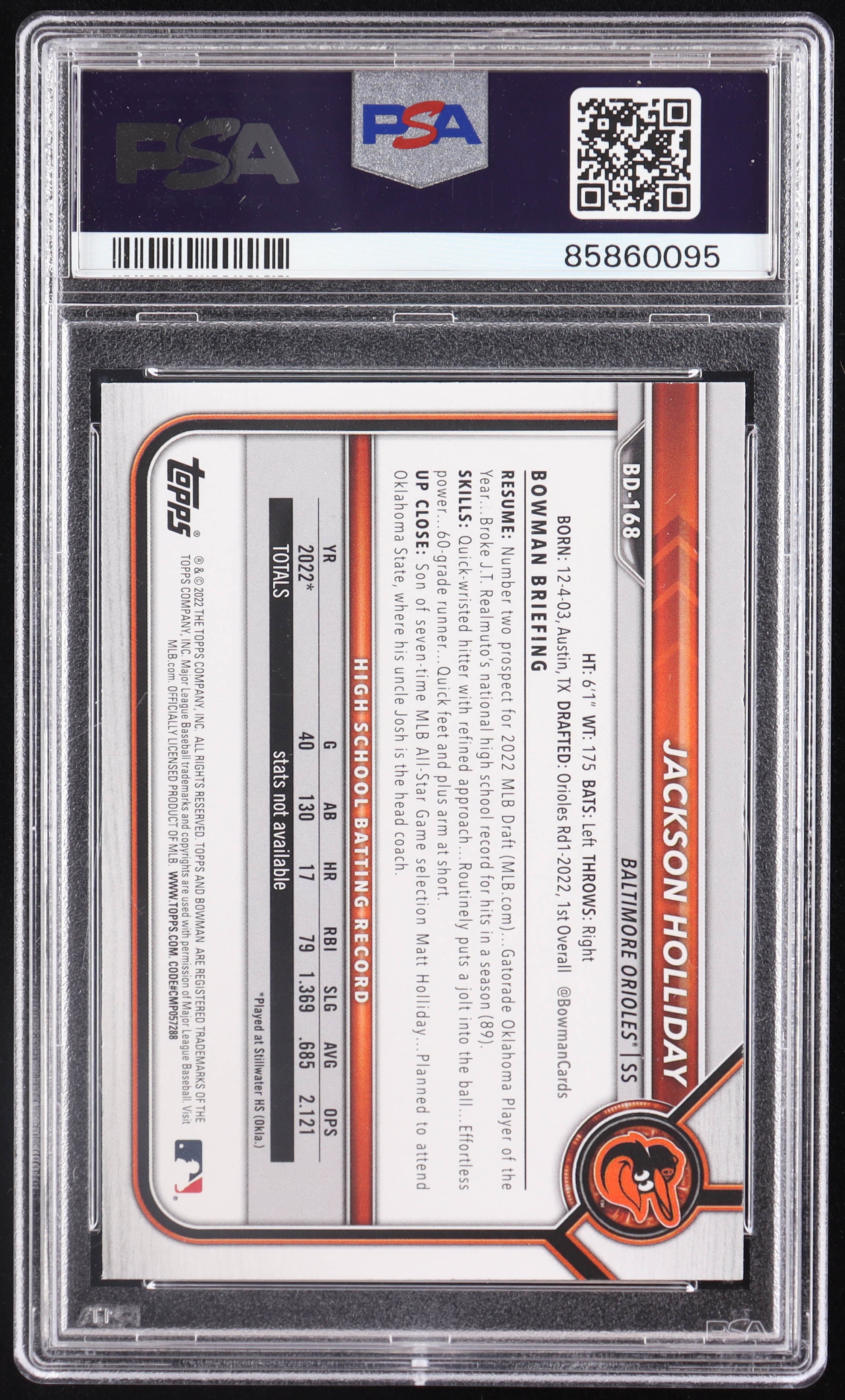 Jackson Holliday 2022 Bowman Draft #BD168 RC (PSA 10)
