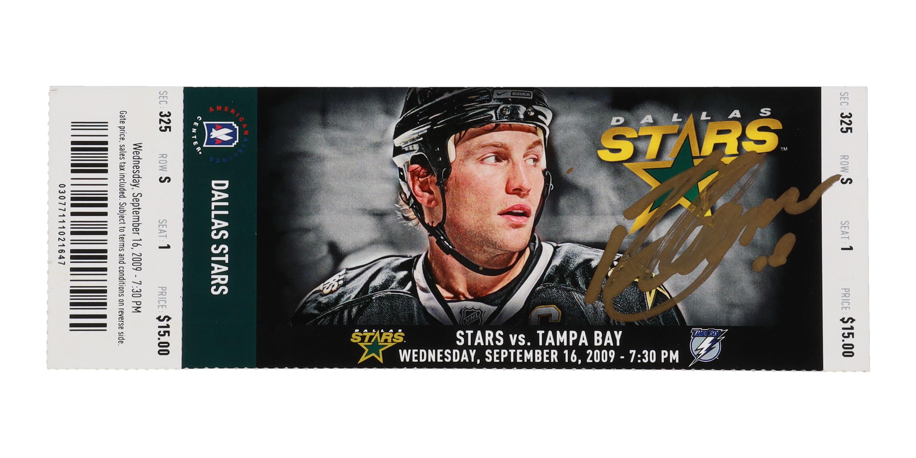 Ticket is dated September 16th, 2009 has been hand-signed by Brenden Morrow (Dallas Stars).