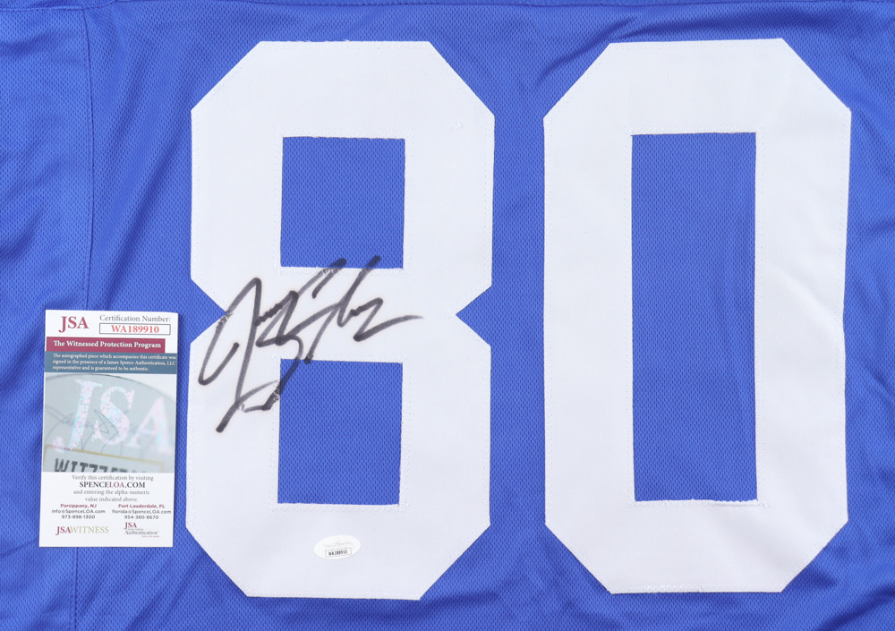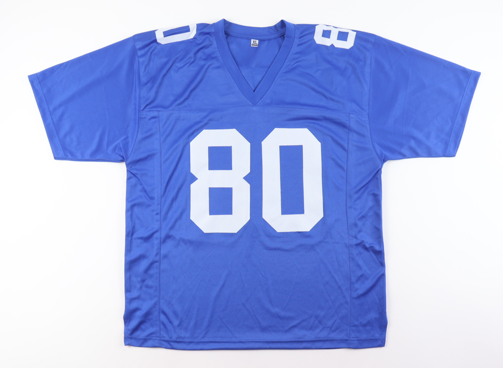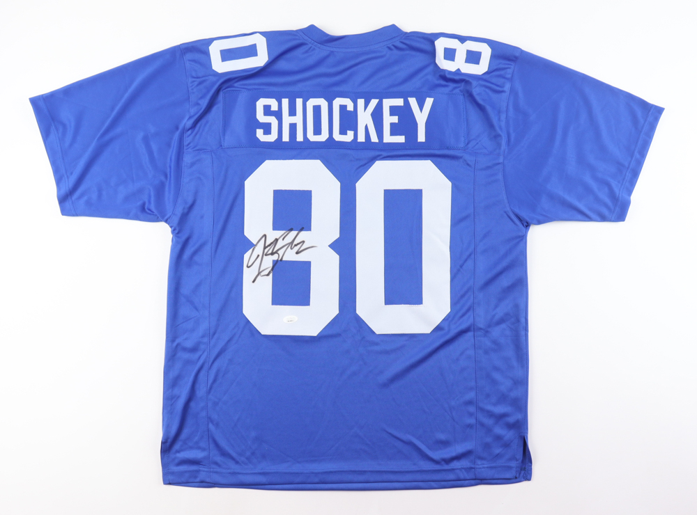 Custom jersey with everything sewn on, size XL. Hand-signed by Jeremy Shockey.