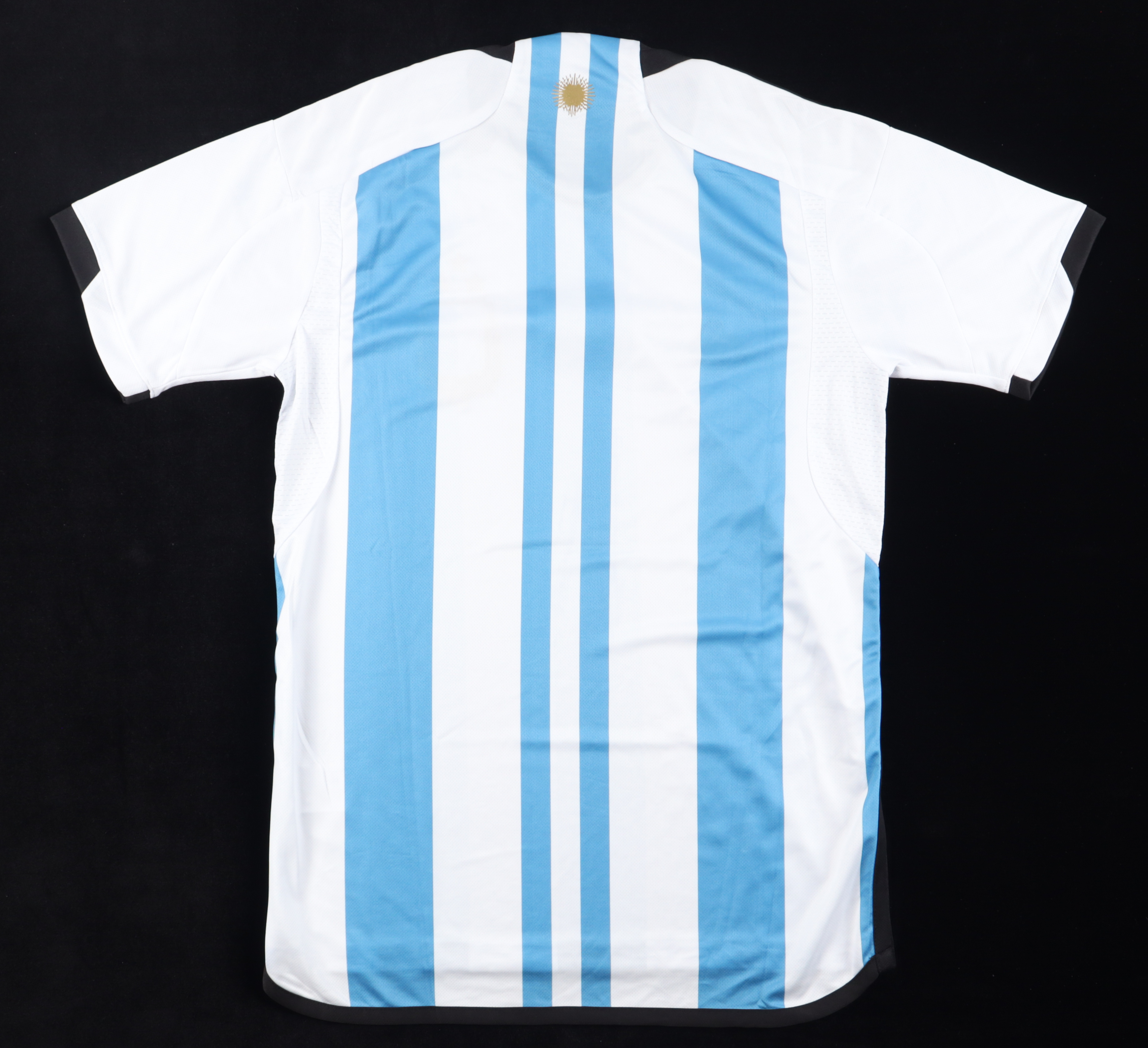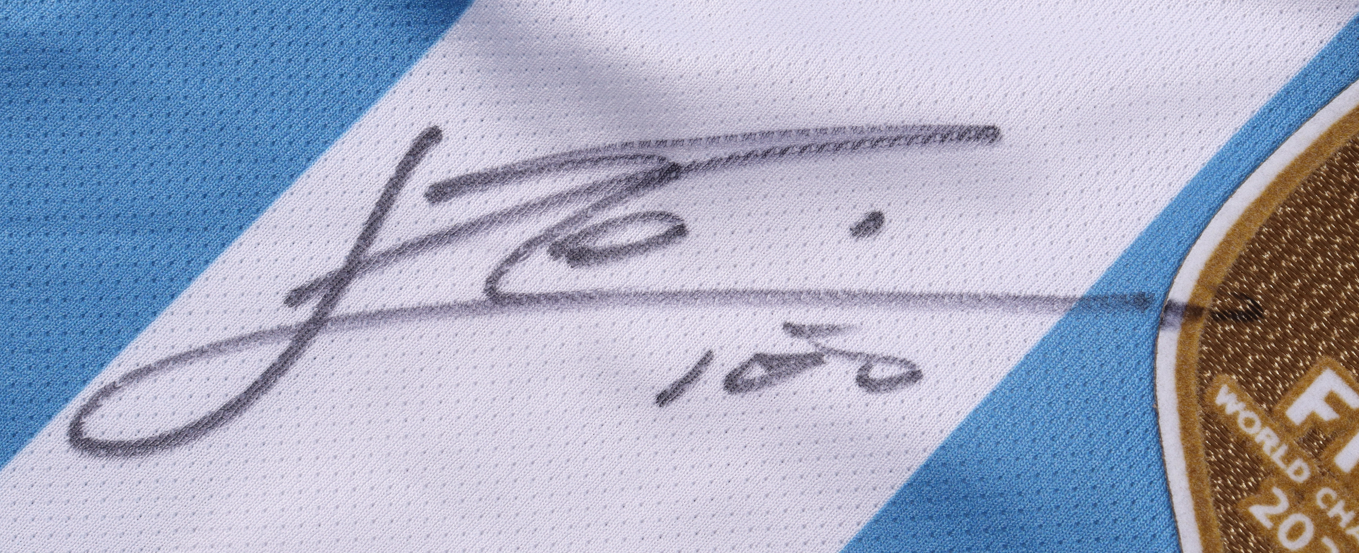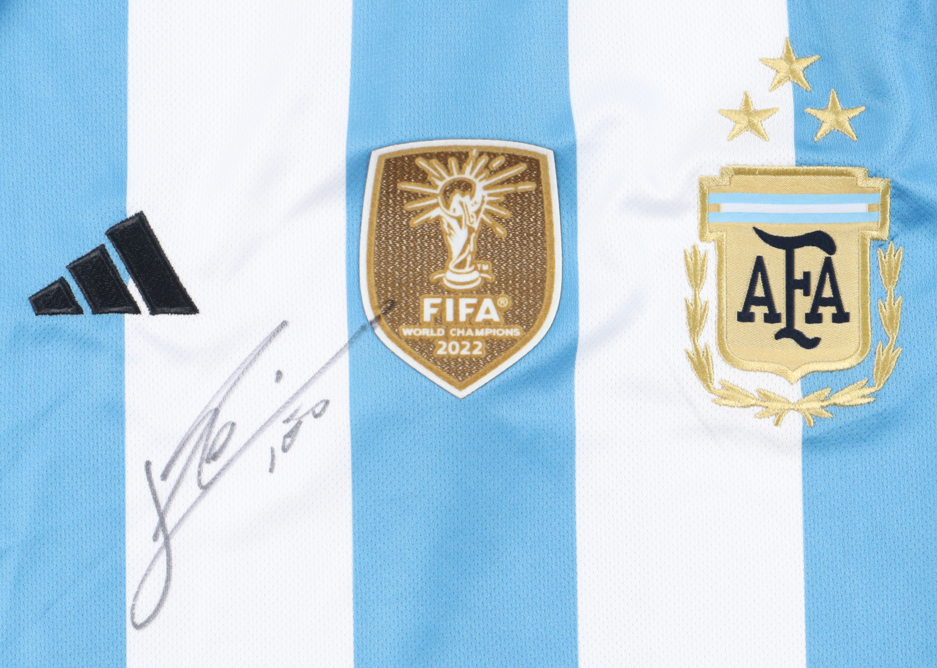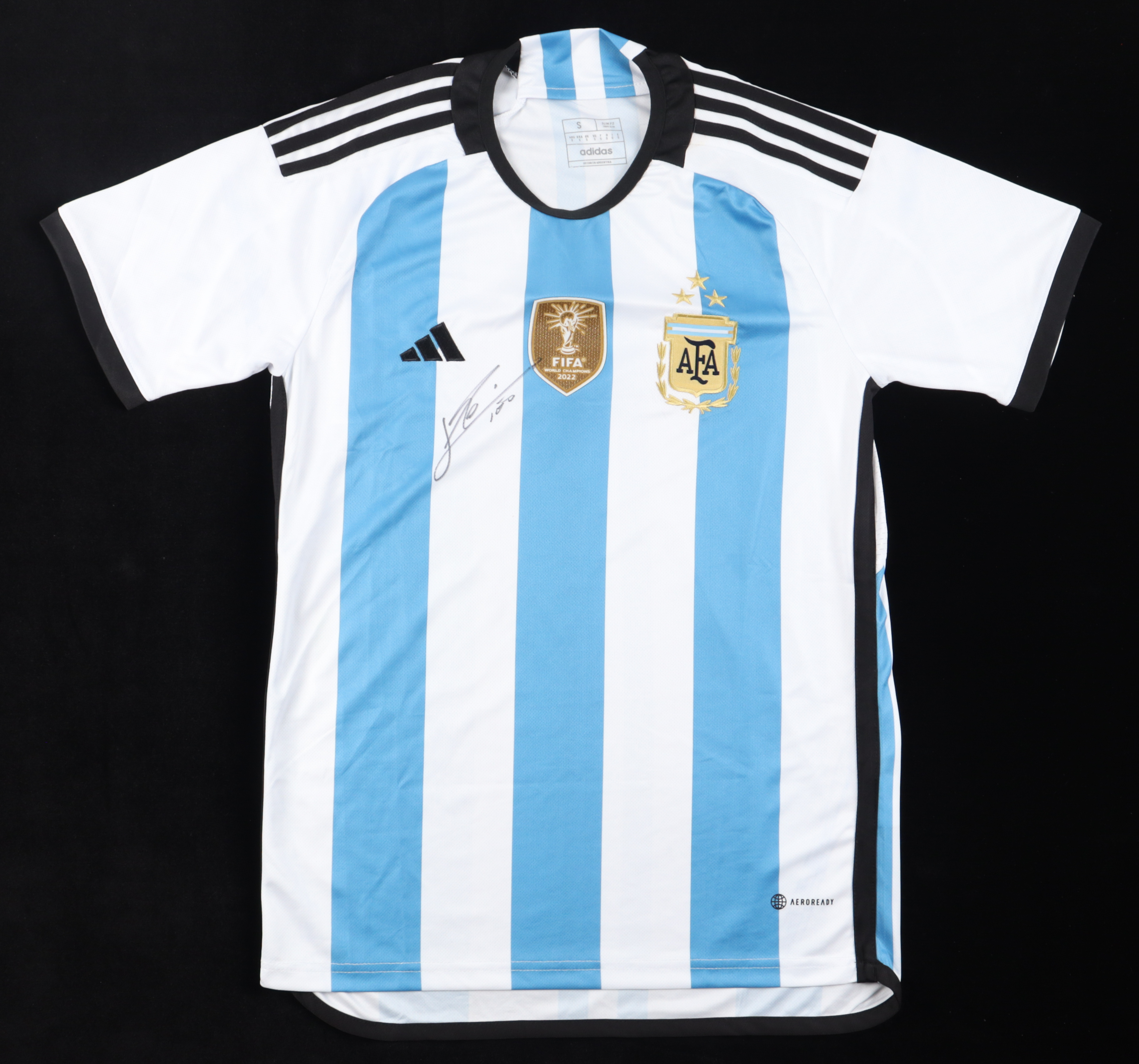 Adidas jersey with everything printed on, size S. Hand-signed and inscribed by Lionel Messi (Team Argentina).