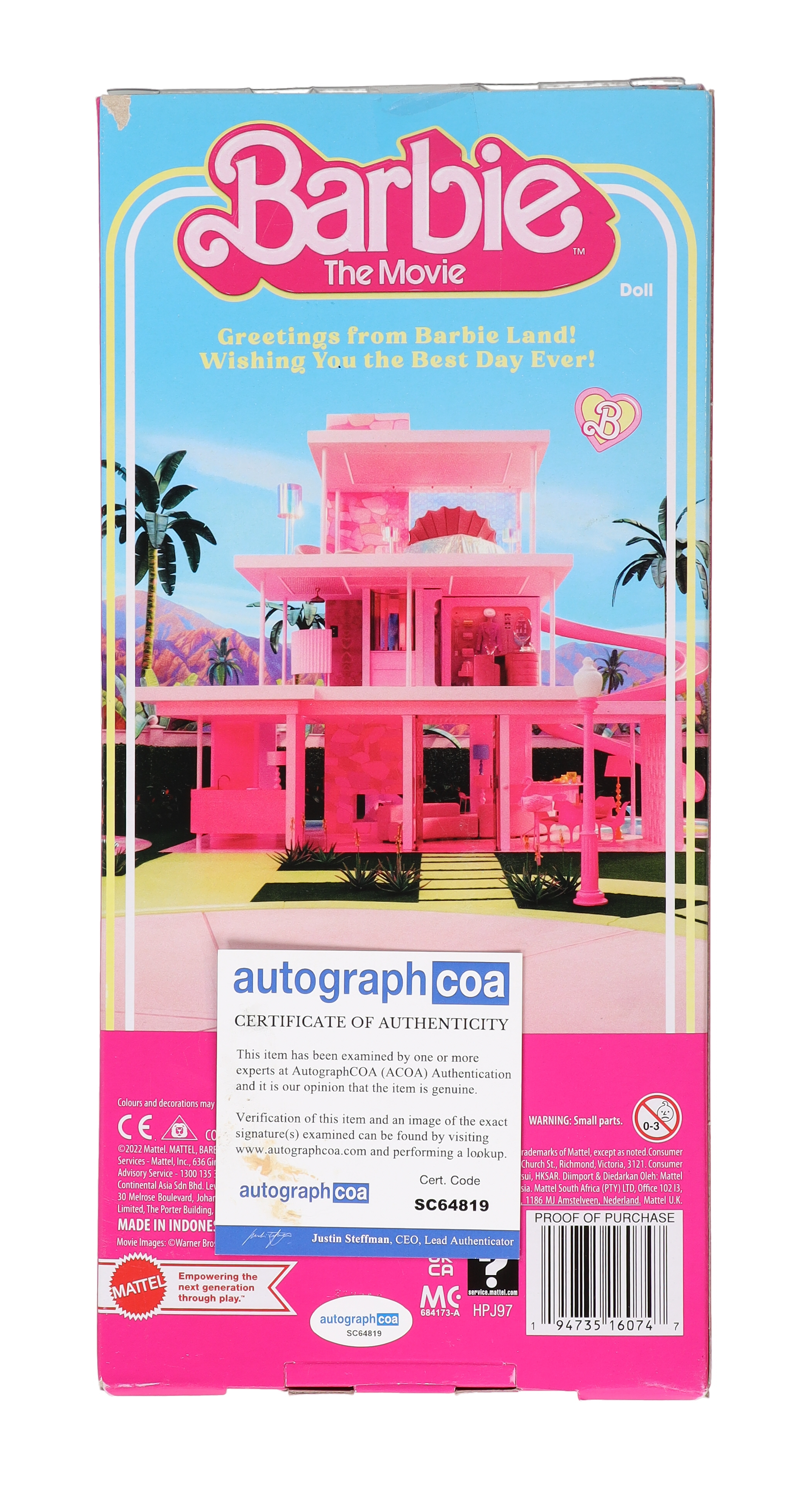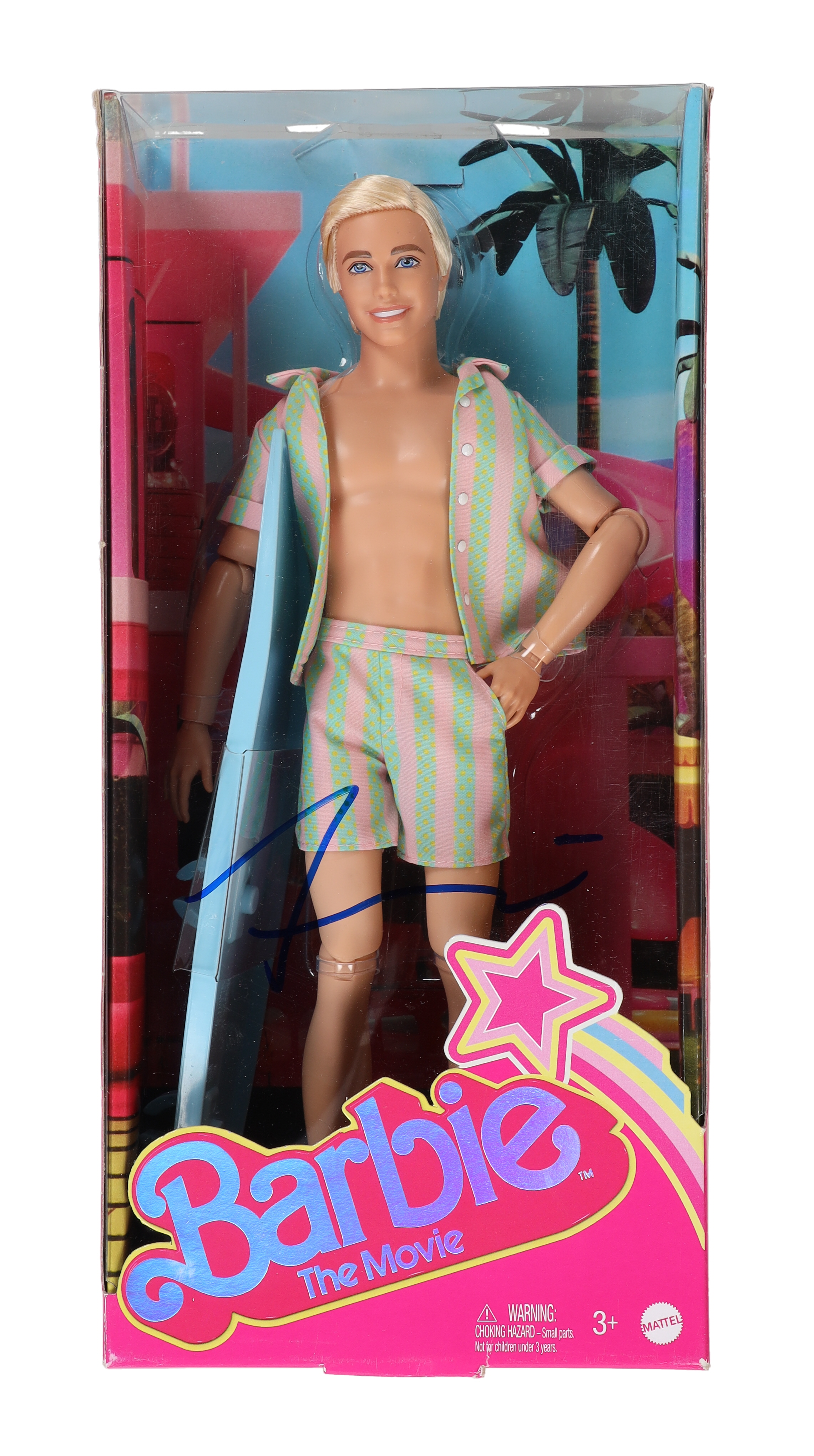 Mattel Ken "Barbie The Movie" figure measures approximately 11" tall and has been hand-signed on the packaging by Ryan Gosling. Please note, tear on the front and damage on the top rear of the packaging.
