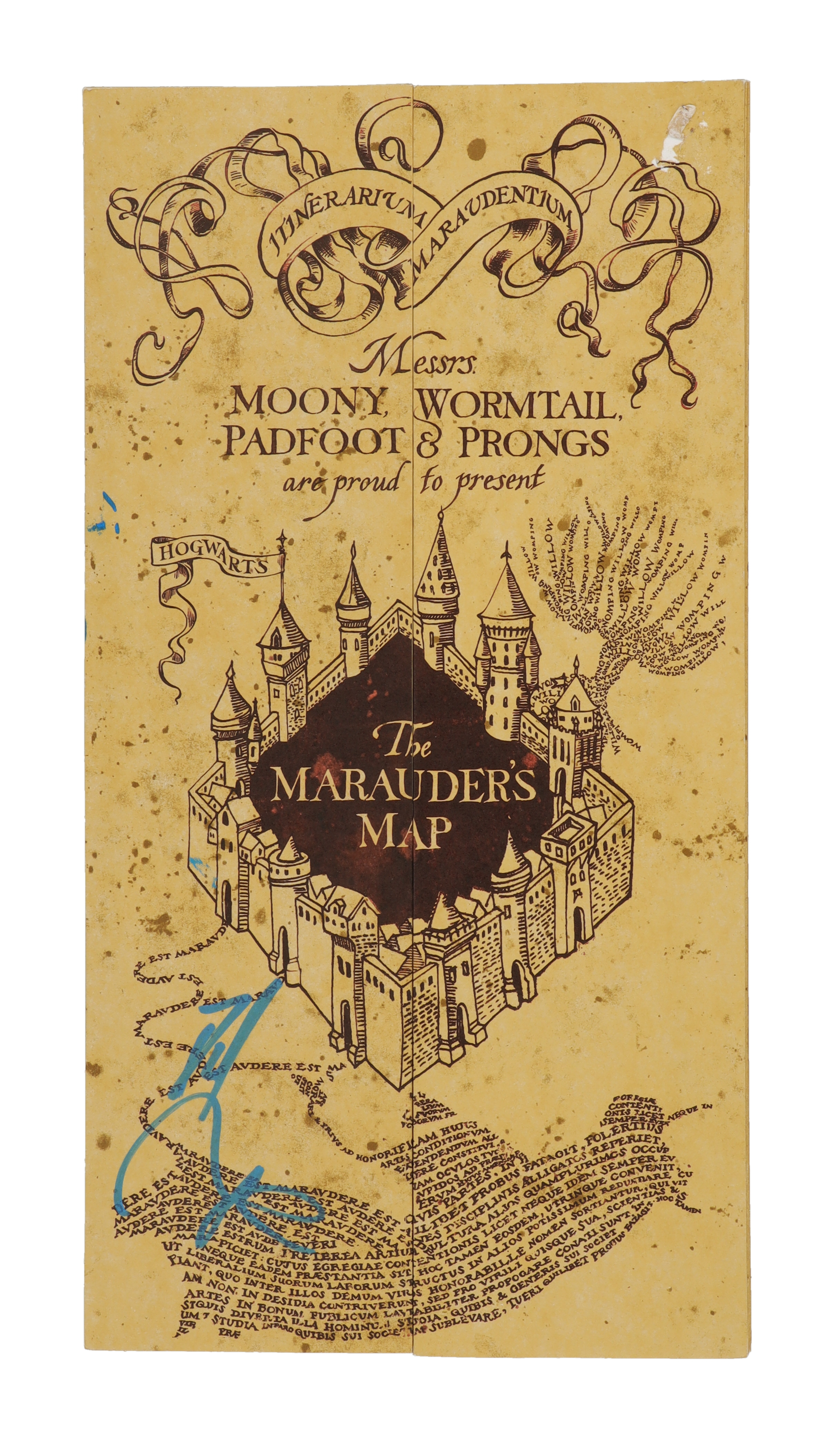 Harry Potter "The Marauder's Map" Replica Map. Hand-signed on the front by Daniel Radcliffe. Please note, damage to the top right corner and stray ink marks.