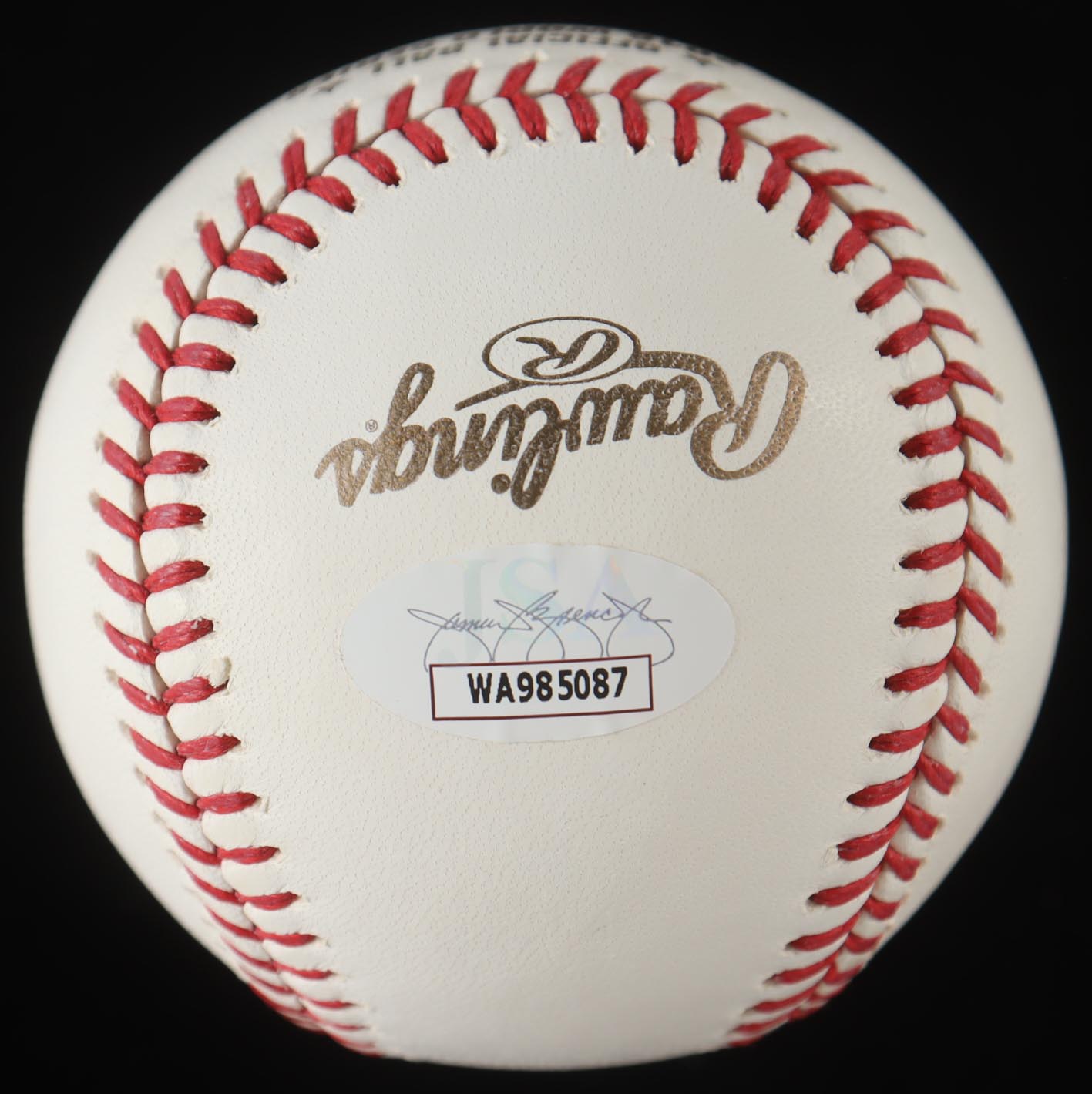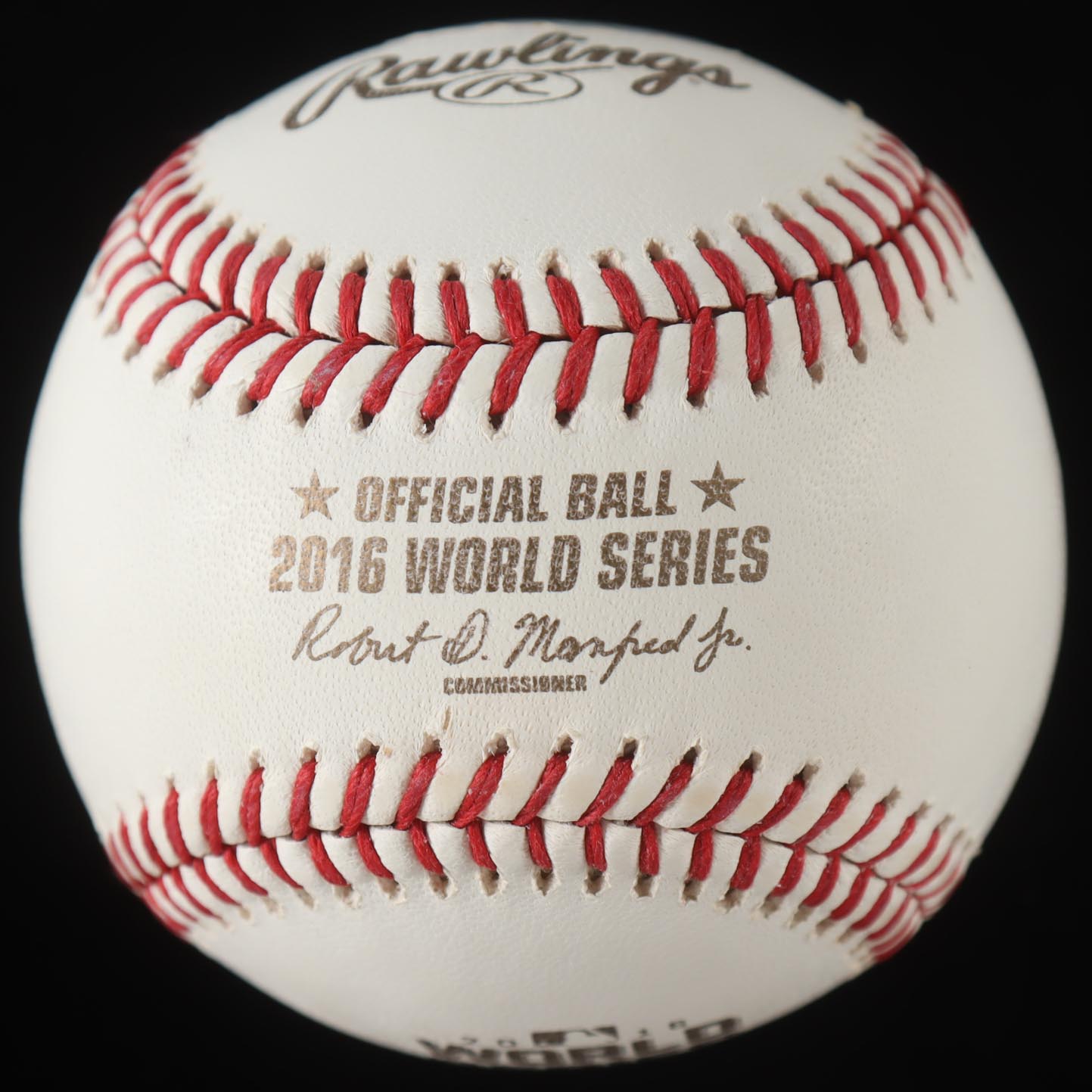 Rawlings Official 2016 World Series logo baseball has been hand-signed and inscribed by Aroldis Chapman (Chicago Cubs).