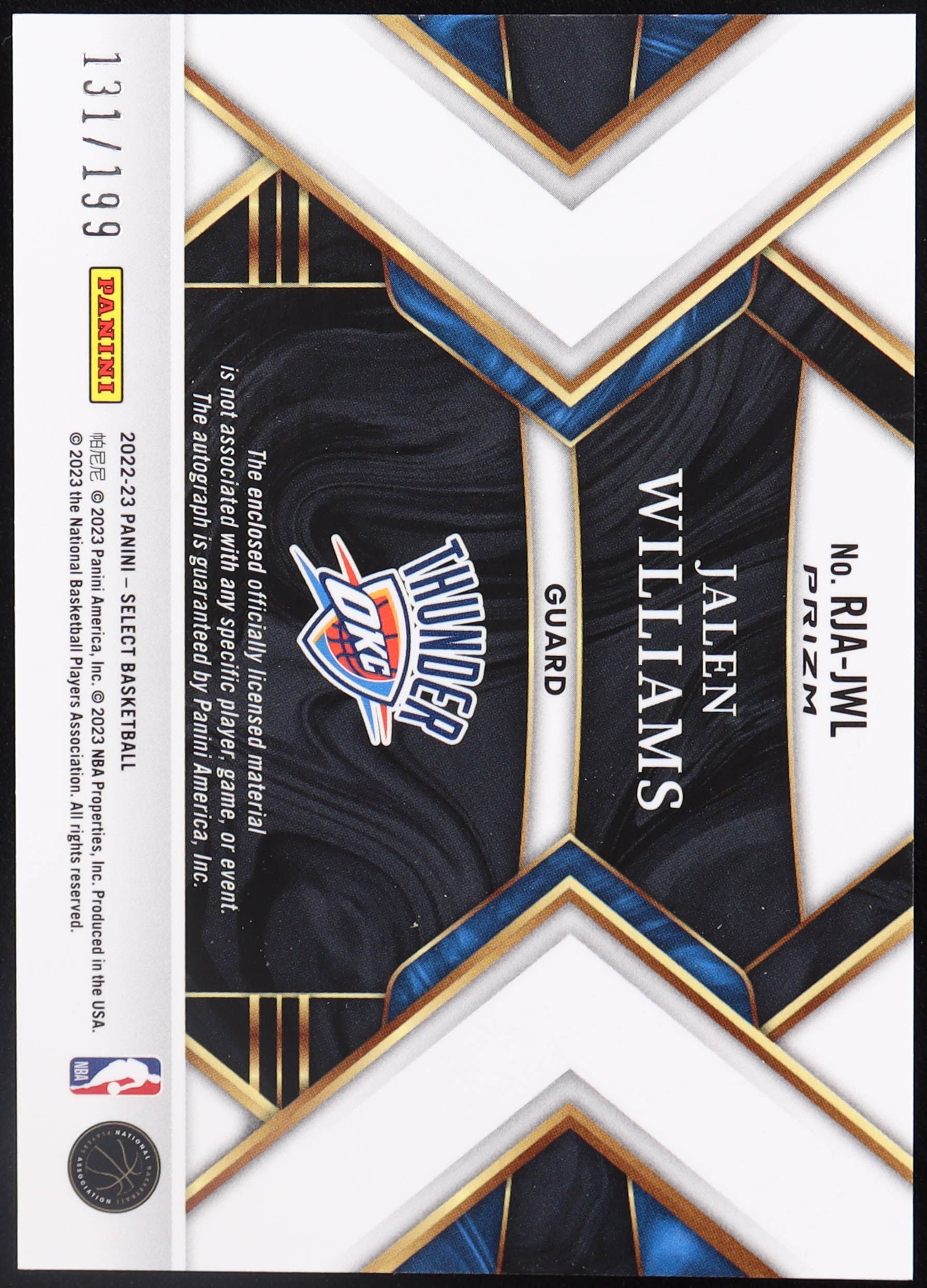 Jalen Williams 2022-23 Select Rookie Jersey Autographs #8 RC #131/199