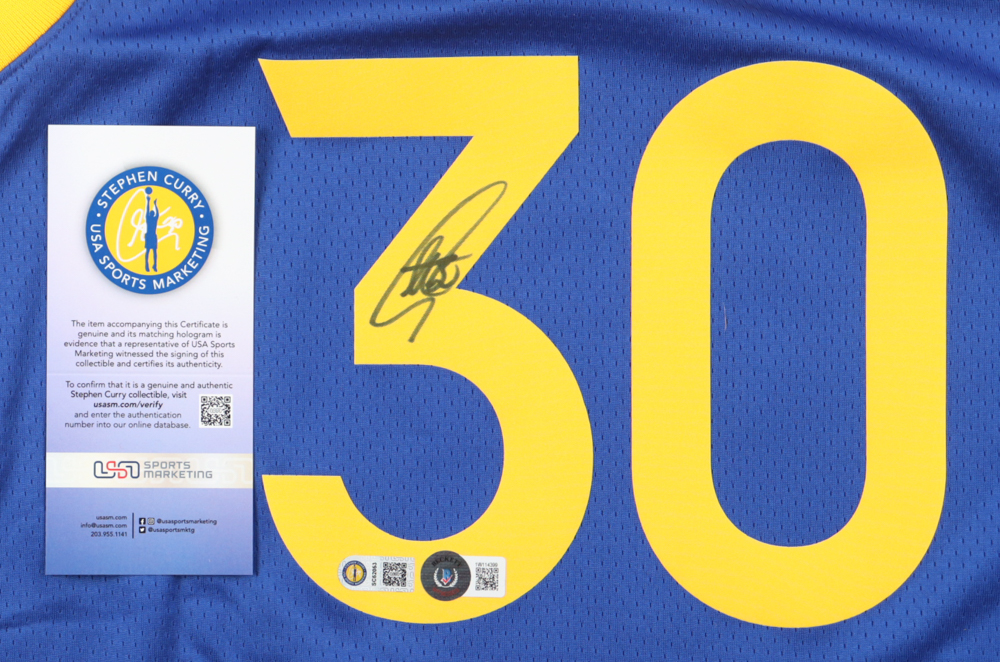 The autograph includes an official Beckett Authentication Services serially numbered hologram for authenticity purposes. The signing of this item was witnessed by Beckett. Also includes an official USA Sports Marketing Stephen Curry hologram for authenticity purposes.