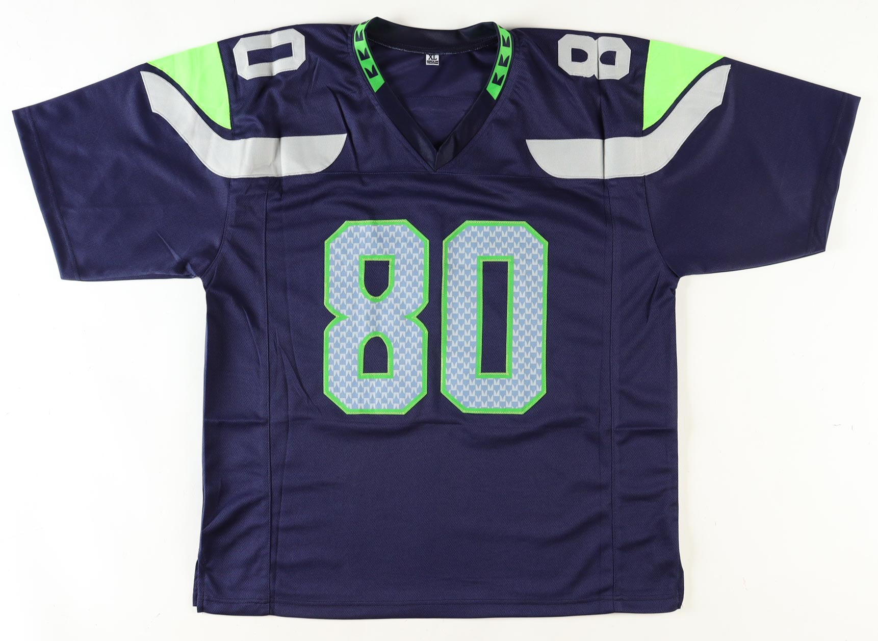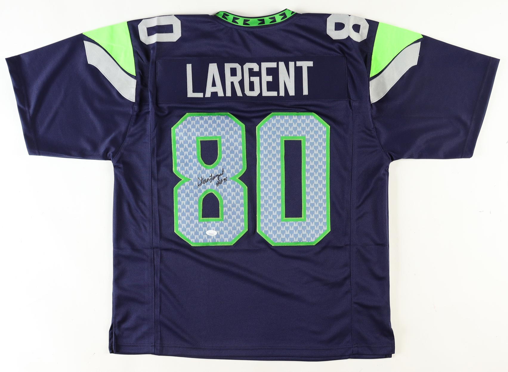 Custom jersey with everything sewn on, size XL. Hand-signed and inscribed by Steve Largent (HOF).