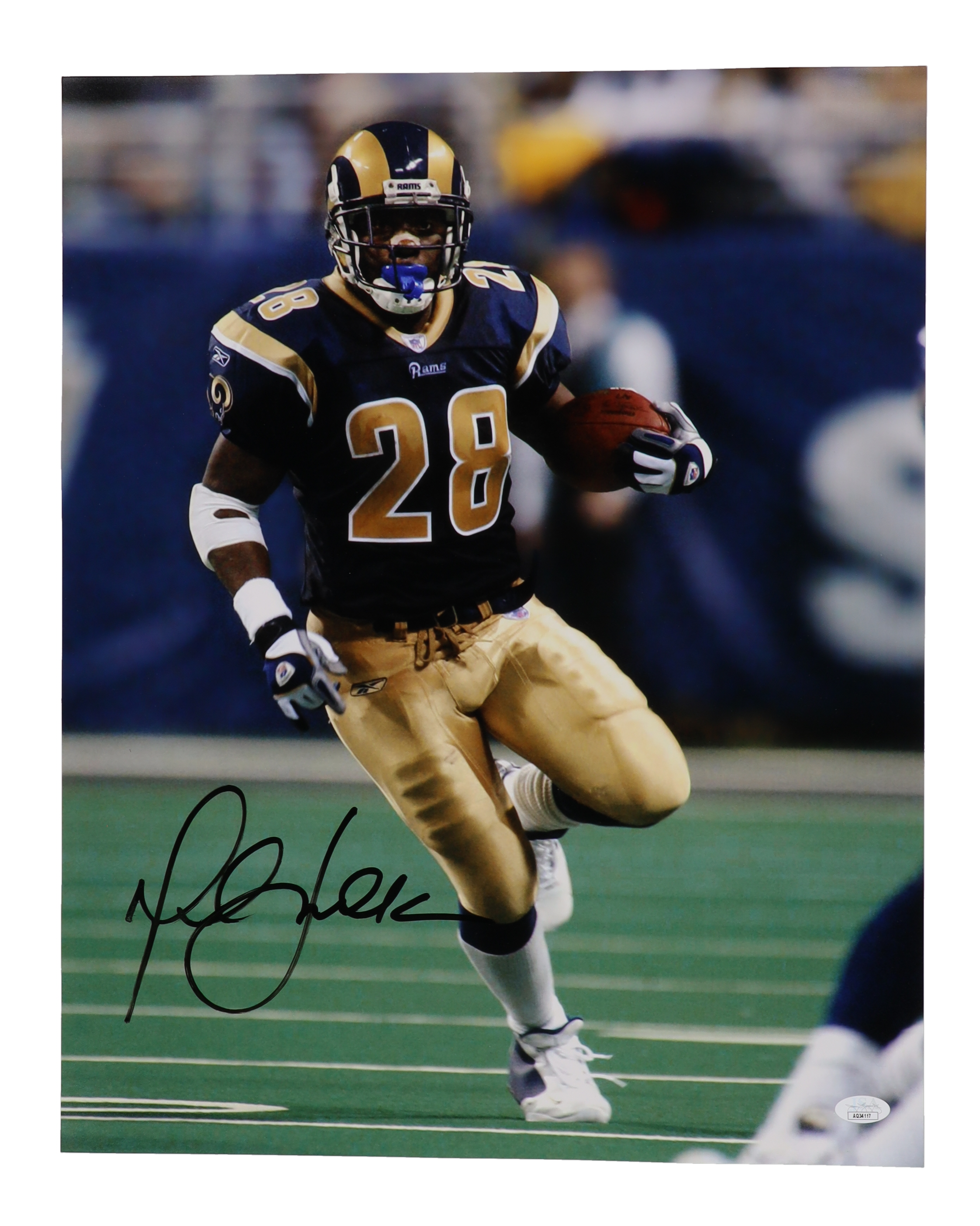 Photo measures 16" x 20" in size and has been hand-signed by Marshall Faulk (St. Louis Rams, HOF).