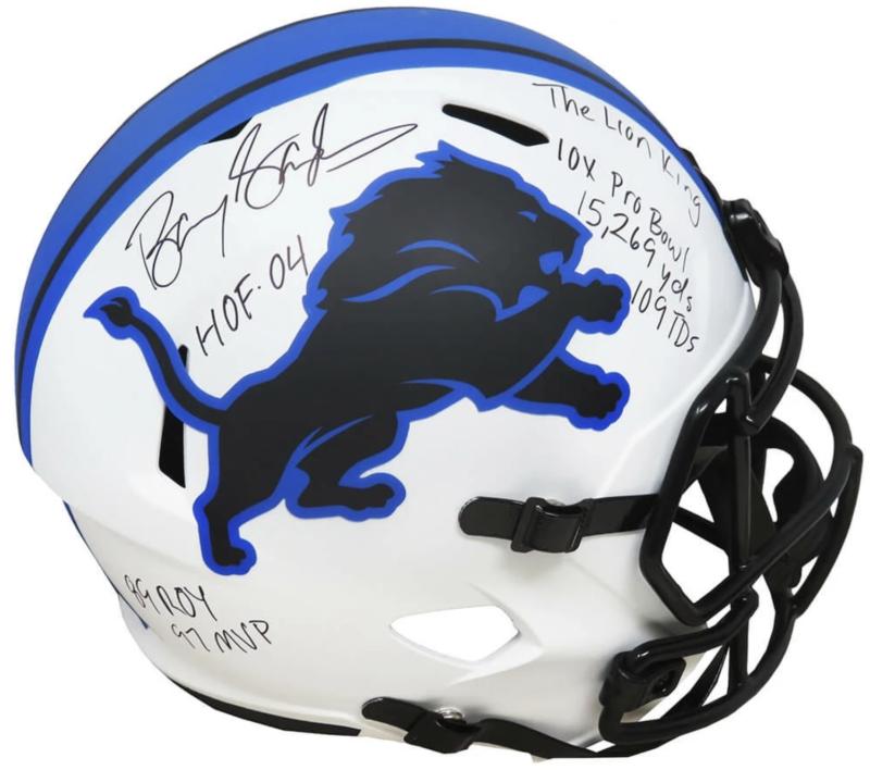 Riddell Detroit Lions full-size lunar eclipse alternate speed replica helmet. Hand-signed and inscribed by Barry Sanders (HOF).