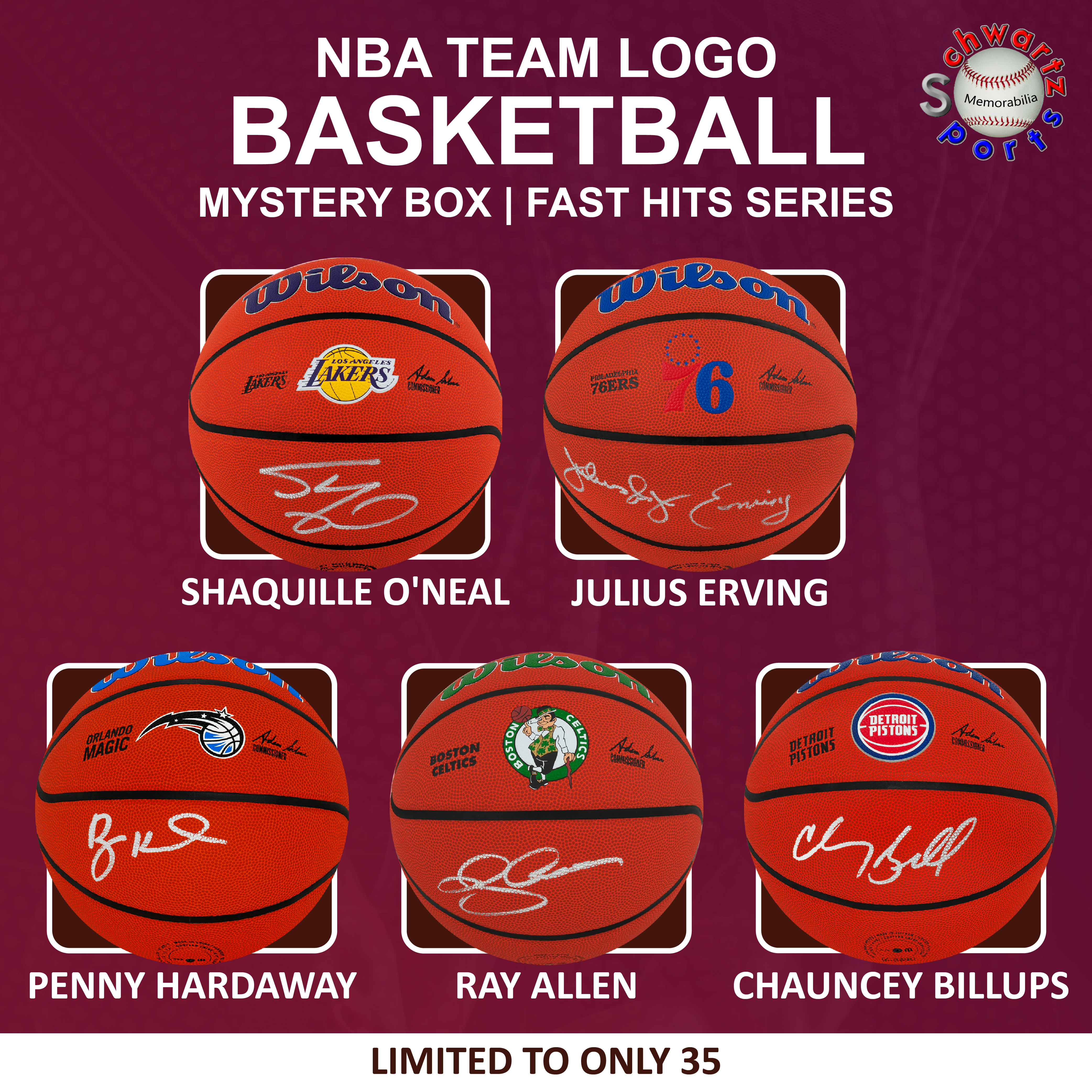 Each box contains one autographed NBA Team Logo Basketball that has been inserted. There are 35 different players included in this FAST HITS Series 3 NBA Team Logo Basketball mystery box, which is a Pristine Exclusive edition that is limited to ONLY 35 boxes.