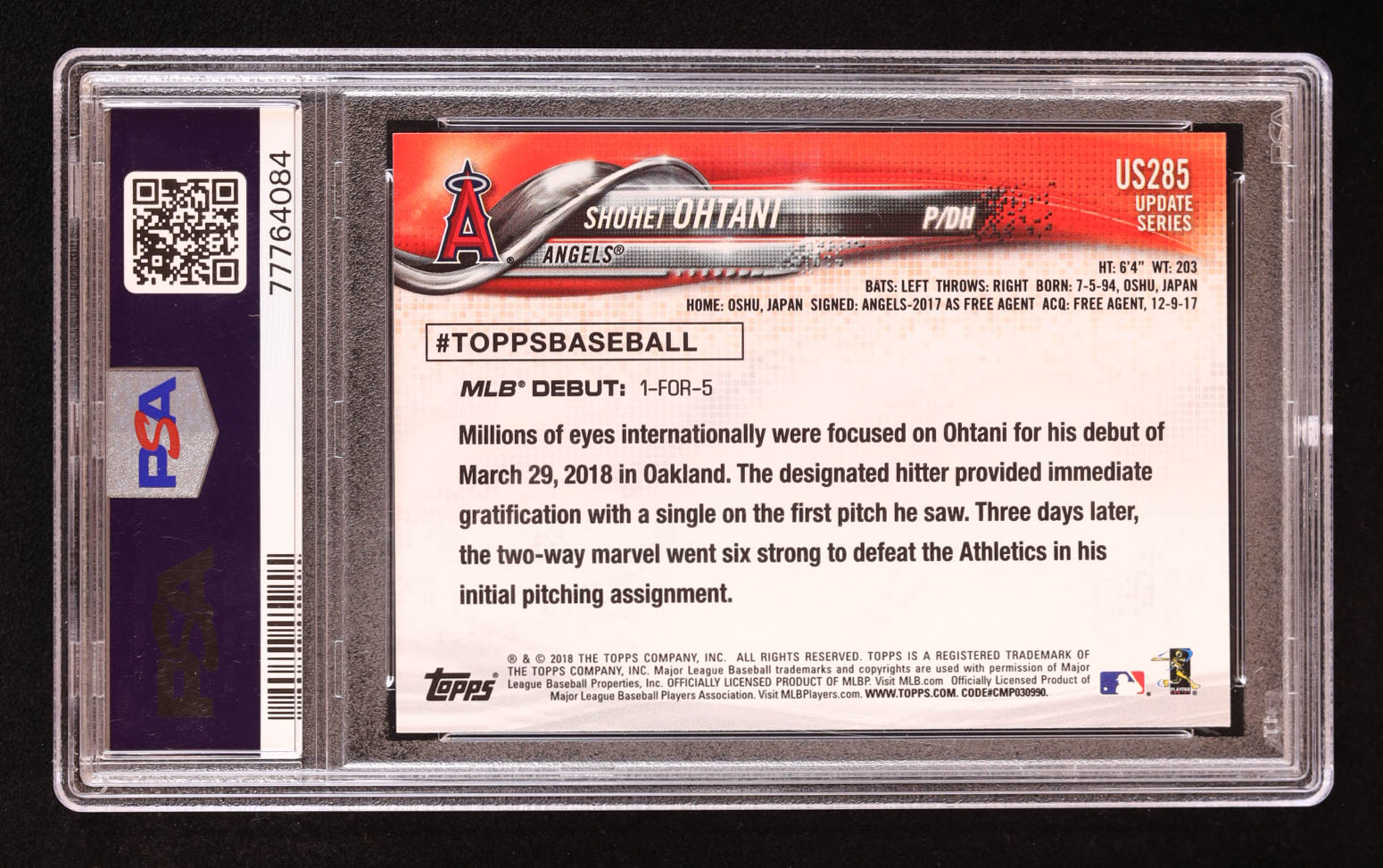 Shohei Ohtani 2018 Topps Update #US285 RD RC (PSA 10)