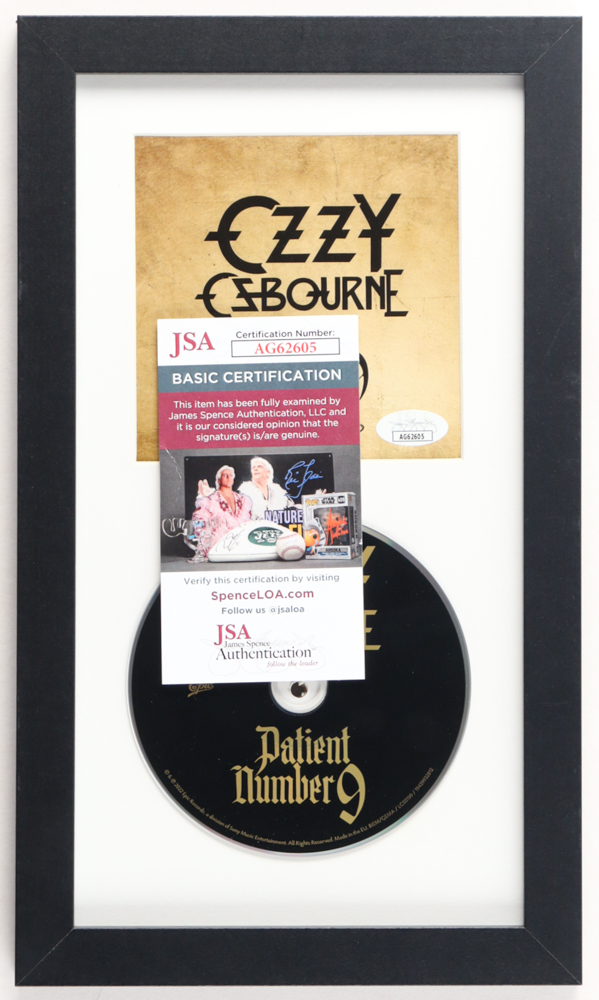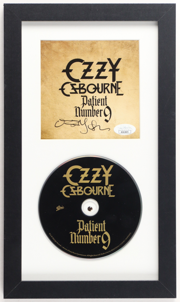 Custom frame measures approximately 8" x 13.5" in size. Features a "Patient Number 9" CD album insert that has been hand-signed by Ozzy Ozbourne (HOF). The display also includes the disc as shown.