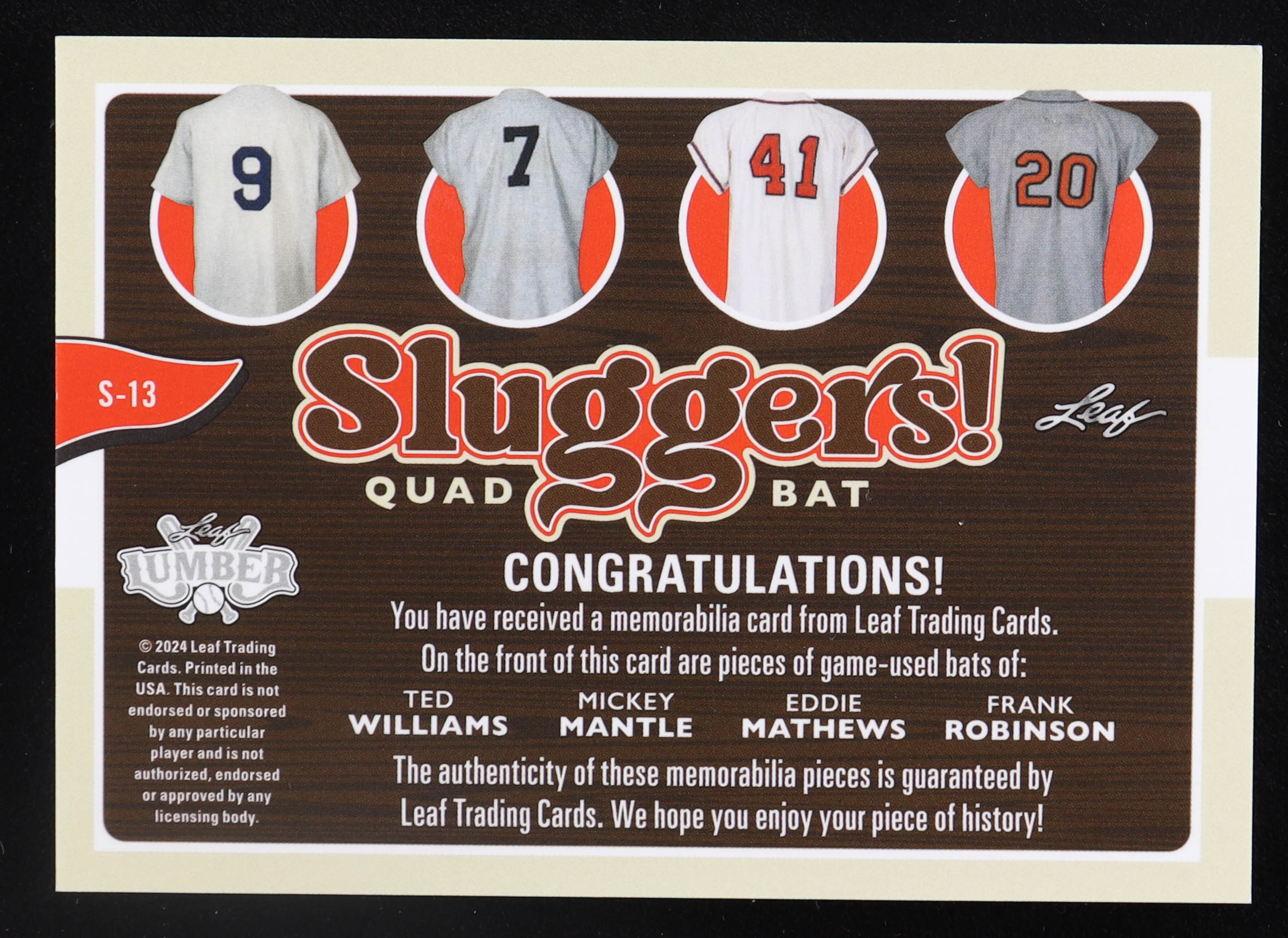 Ted Williams / Mickey Mantle / Eddie Mathews / Frank Robinson 2024 Leaf Lumber Sluggers Quad Bat #S13 #3/6