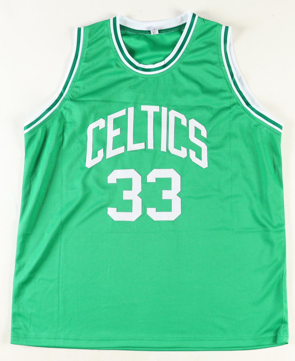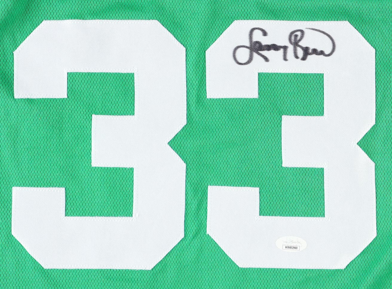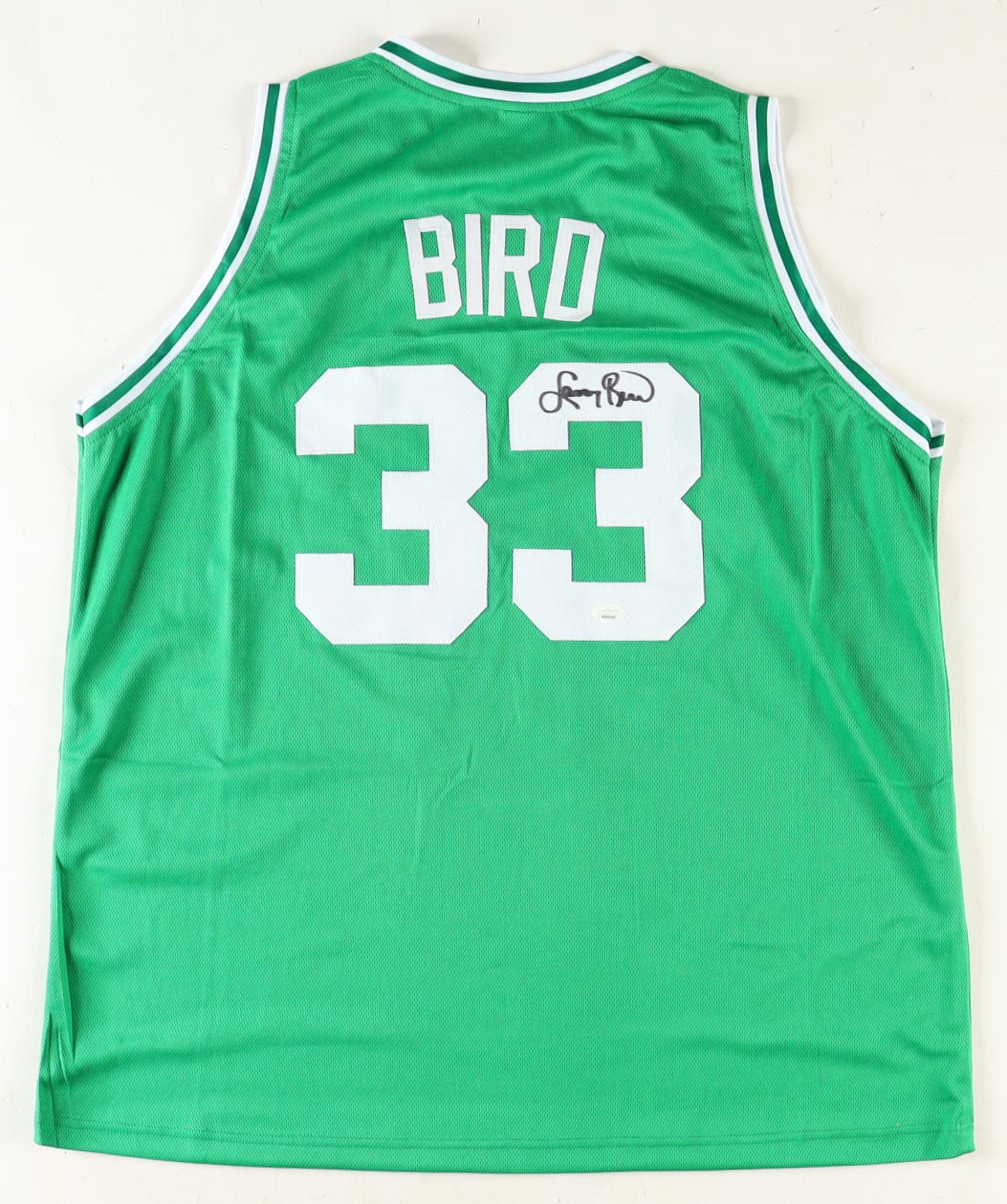 Custom jersey with everything sewn on, size XL. Hand-signed by Larry Bird (HOF).