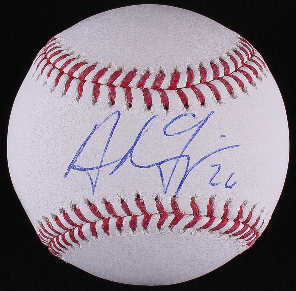Rawlings baseball has been hand-signed in blue ink by pen Adam Frazier (Pirates).