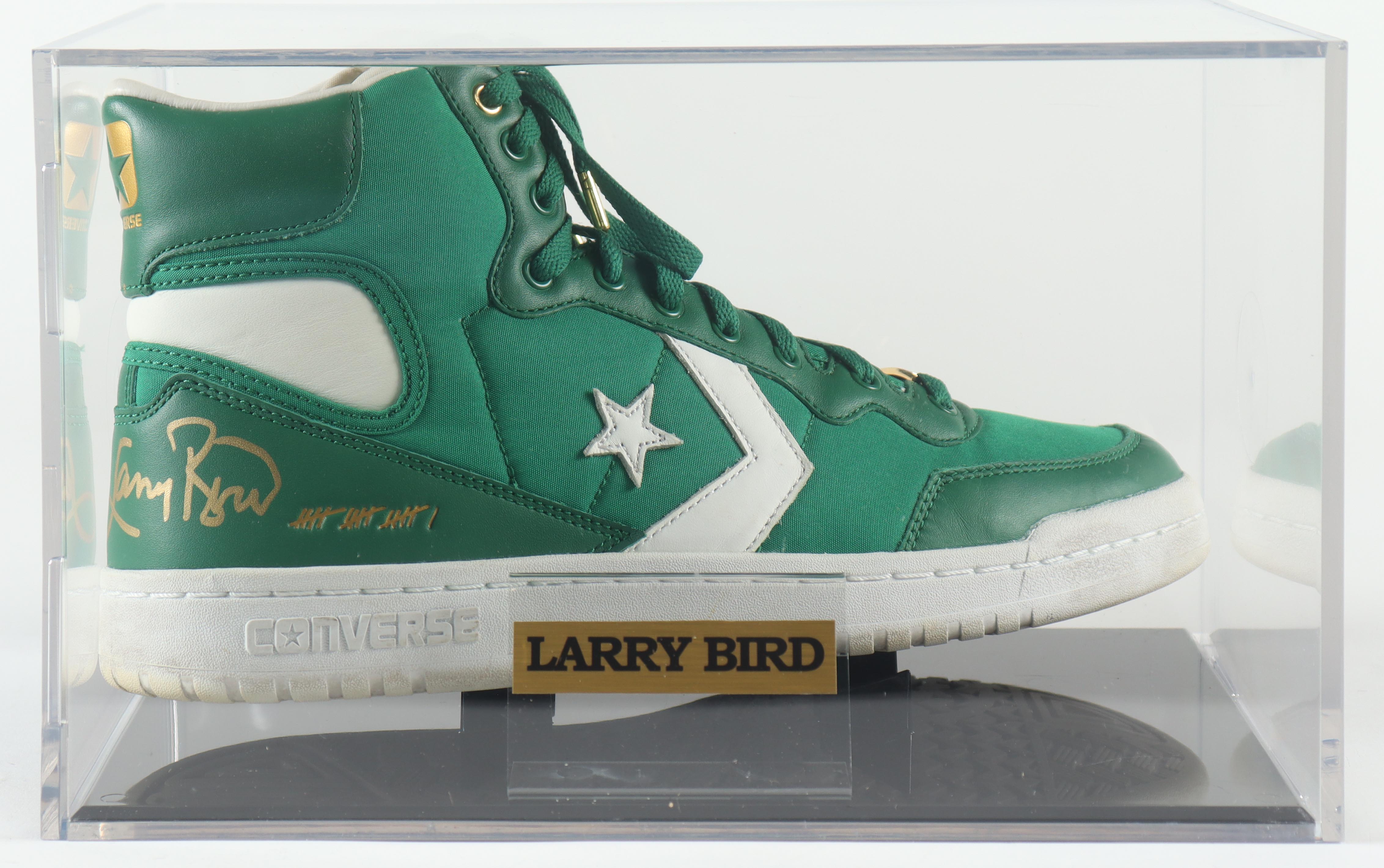 Converse All-Star basketball shoe, size 10.5. Hand-signed by Larry Bird (Boston Celtics, HOF). Display case is included as shown.