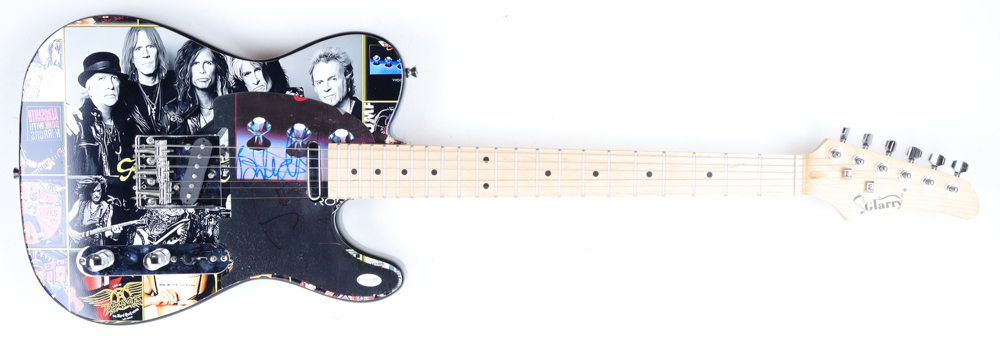 Full-Size Glarry Electric guitar measures approximately 39" in length and has been hand-signed by Joe Perry and Brad Whitford.