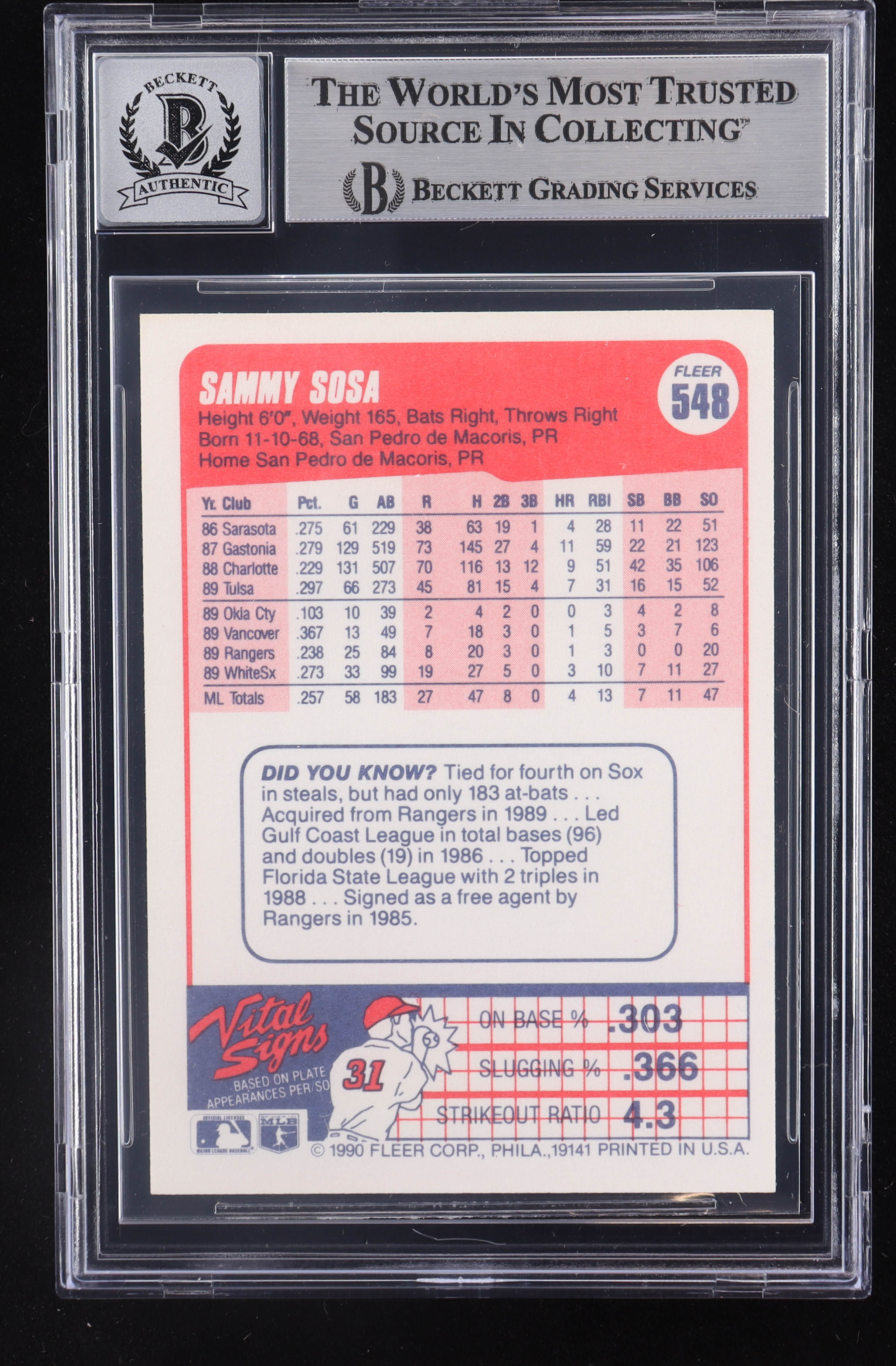 Sammy Sosa Signed 1990 Fleer #548 RC (BGS | Auto 10)