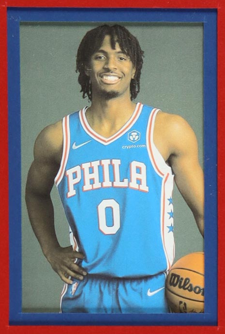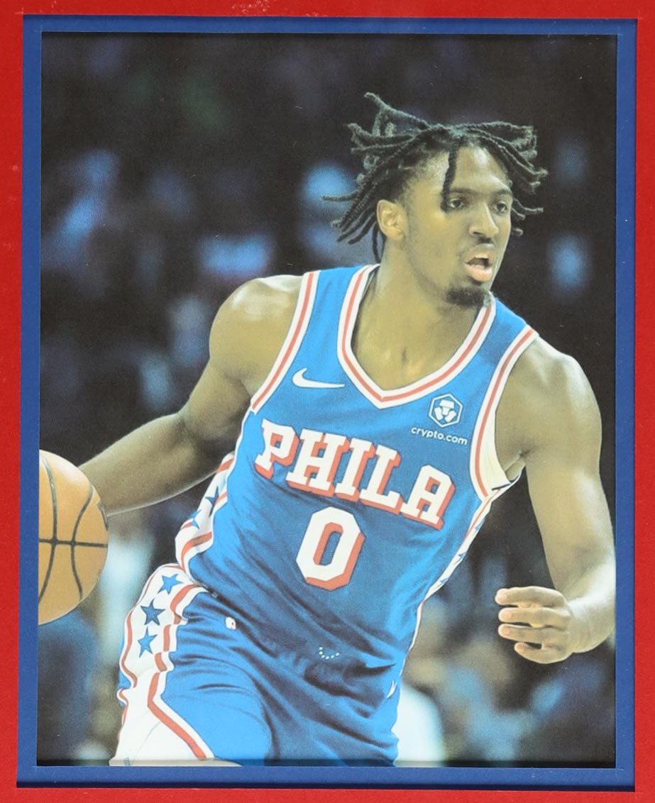 Custom frame measures approximately 34.5" x 42" in size and features a jersey that has been hand-signed by Tyrese Maxey. Please note, there is some corner wear on the frame.