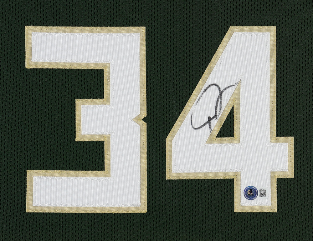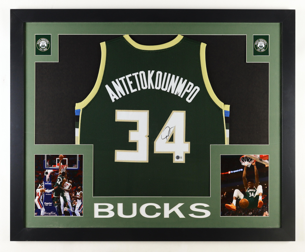 Custom frame measures approximately 35" x 43" in size and features a jersey hand-signed by Giannis Antetokounmpo.