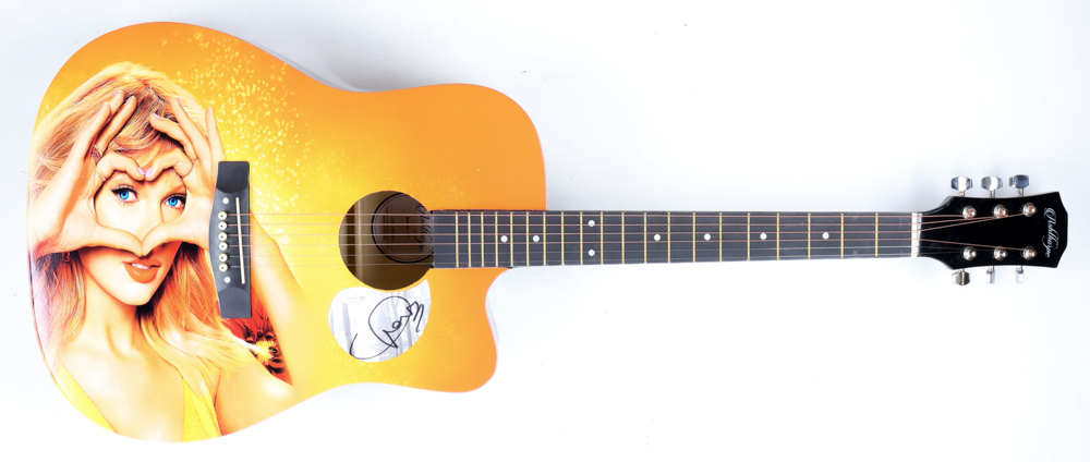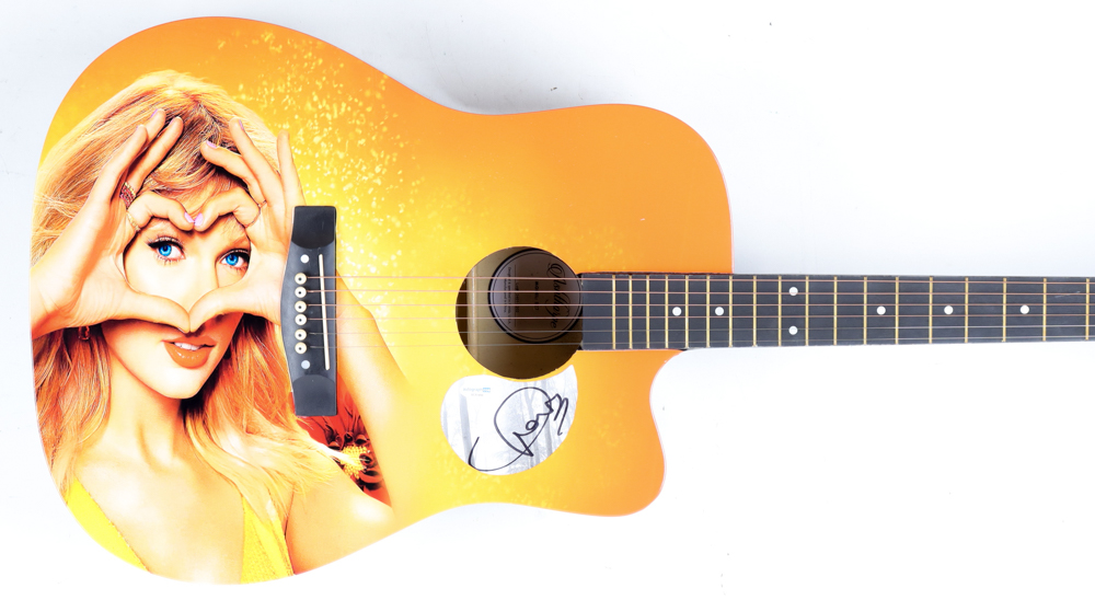 Ashthorpe acoustic guitar has been hand-signed on an album flat that has been repurposed as a pickguard by Taylor Swift.