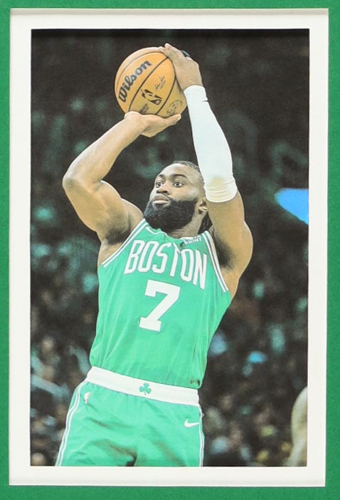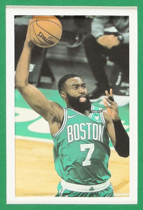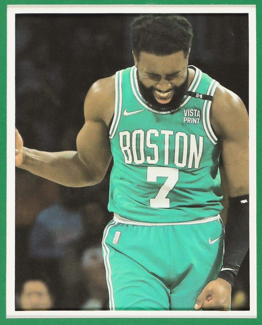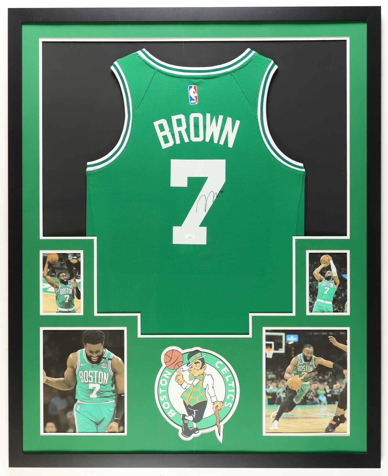Custom frame measures approximately 34" x 42" in size and features a jersey that has been hand-signed by Jaylen Brown. Please note, there is some corner wear on the frame.