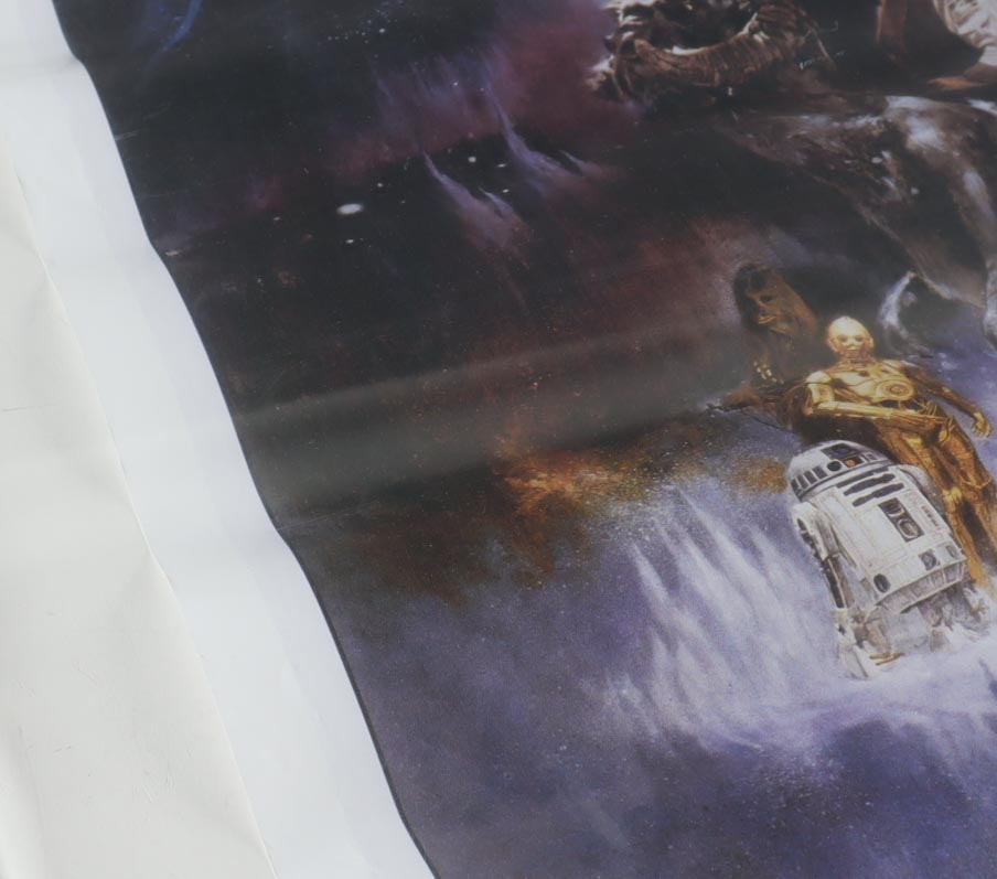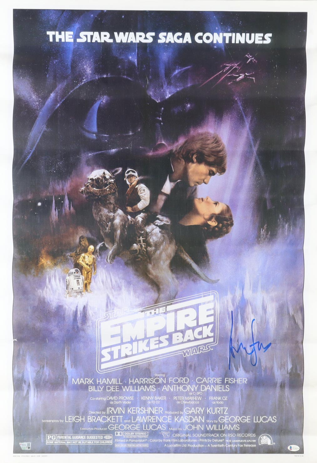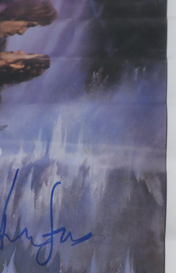 Poster measures 27" x 40" in size and has been hand-signed by Harrison Ford (Han Solo). Please note, creasing throughout the photo.