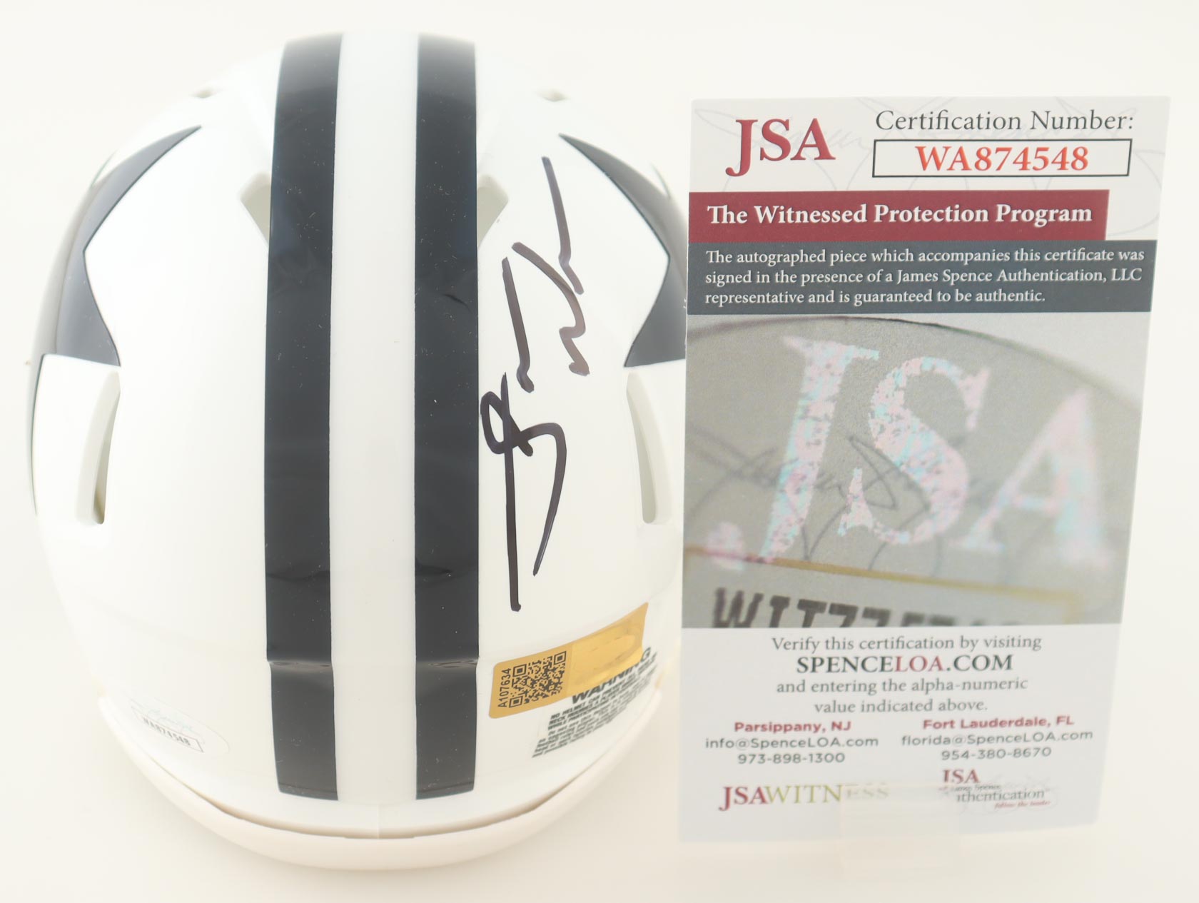 The autograph includes an official James Spence Authentication (JSA) hologram and matching COA as well as an official Players Ink Authentication hologram for authenticity purposes. The signing of this item was witnessed by JSA.