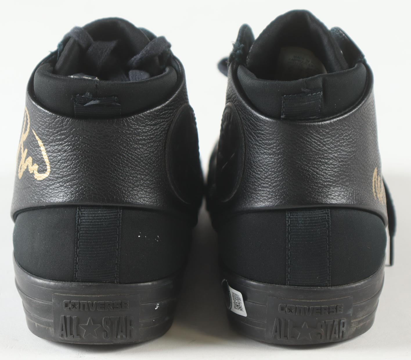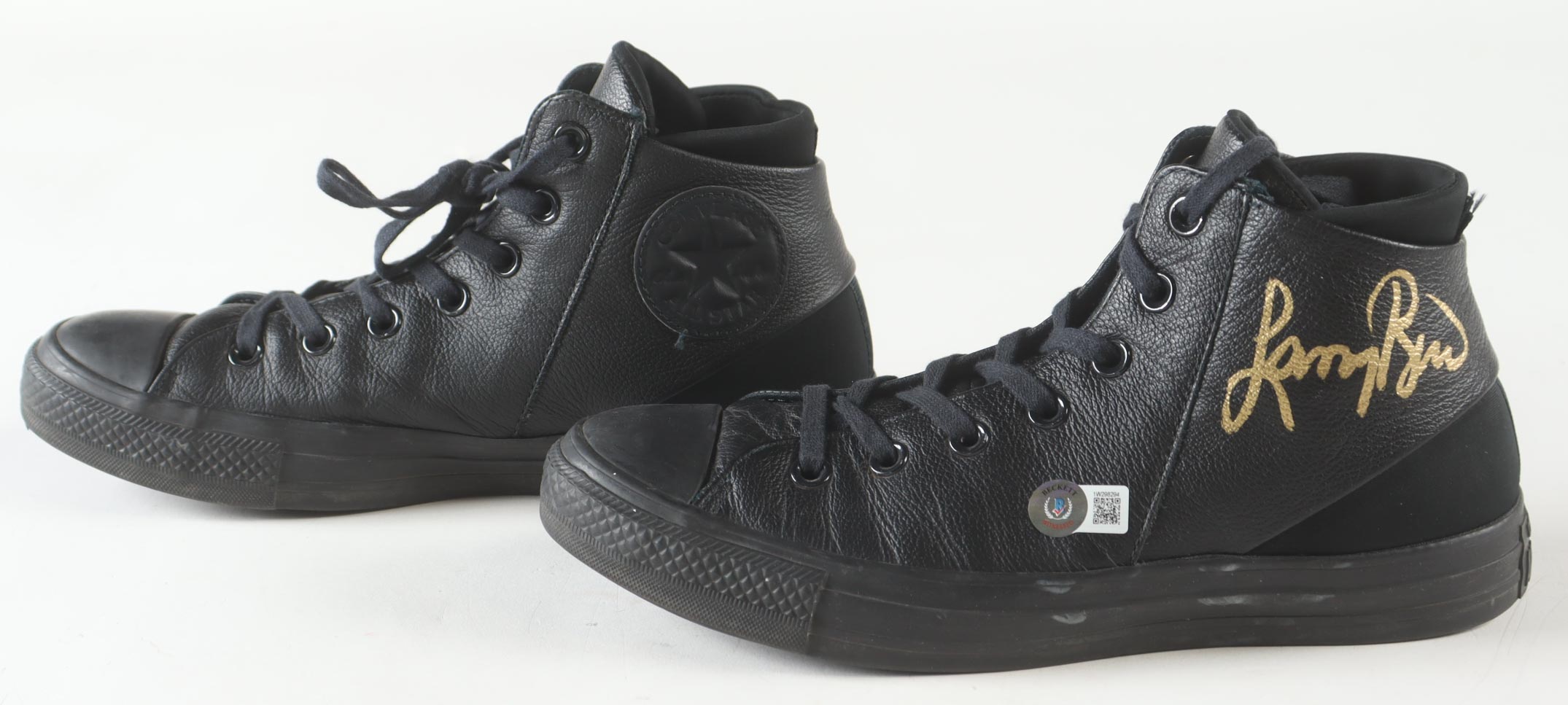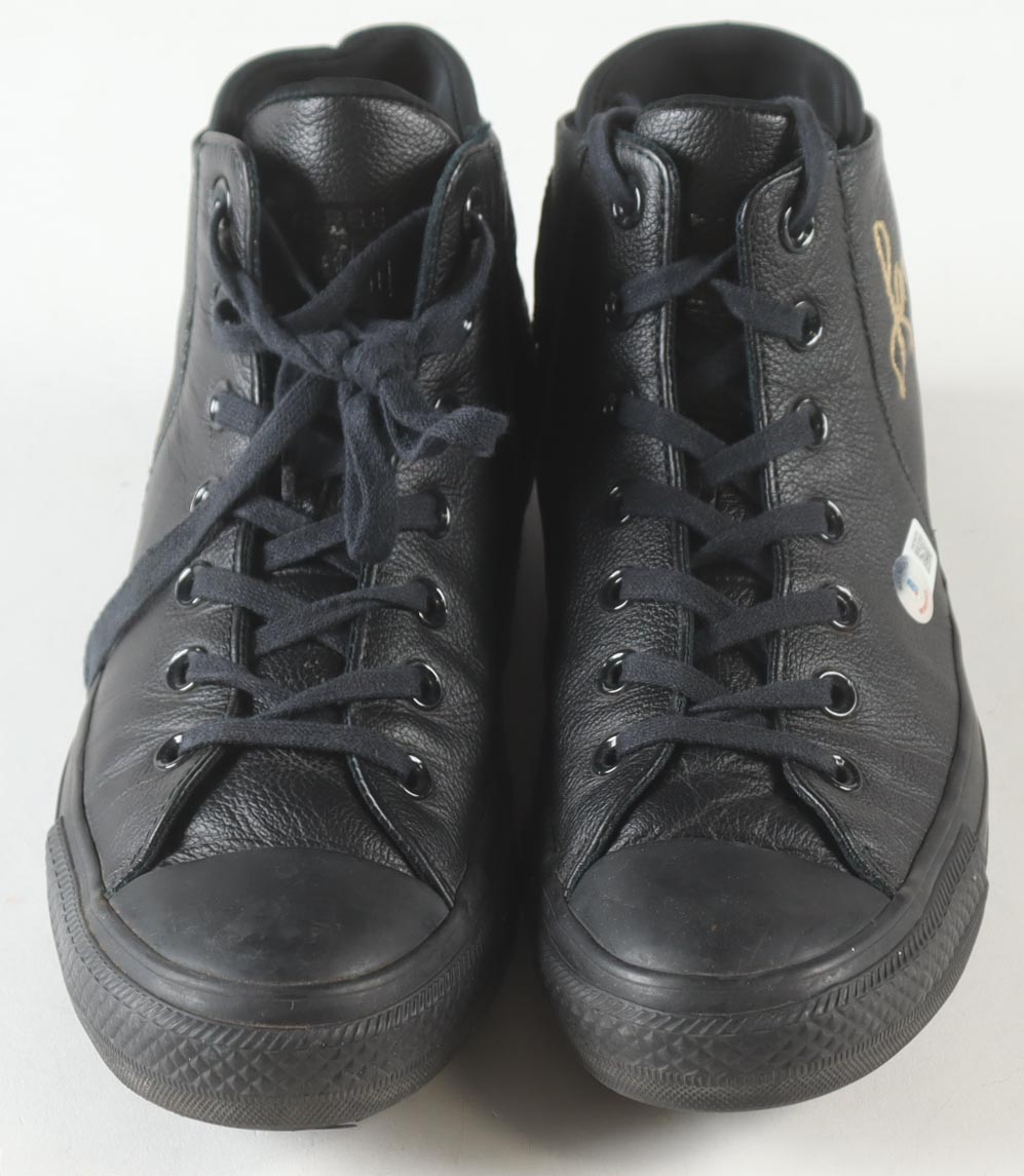 Pair of Converse All-Star Black Leather basketball shoes. Hand-signed by Magic Johnson (Los Angeles Lakers, HOF) and Larry Bird (Boston Celtics, HOF). Display case is included, as shown.