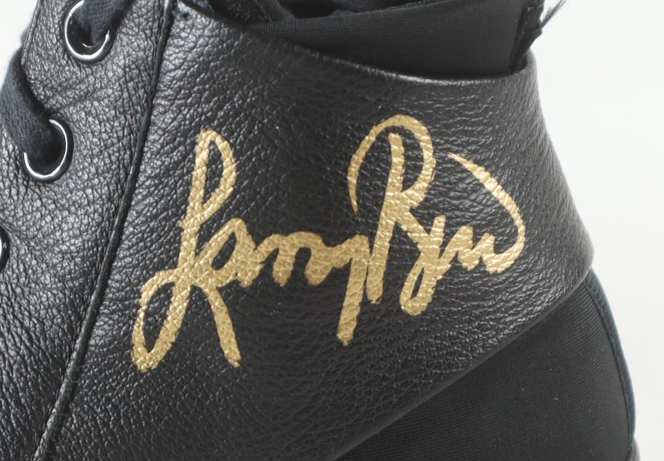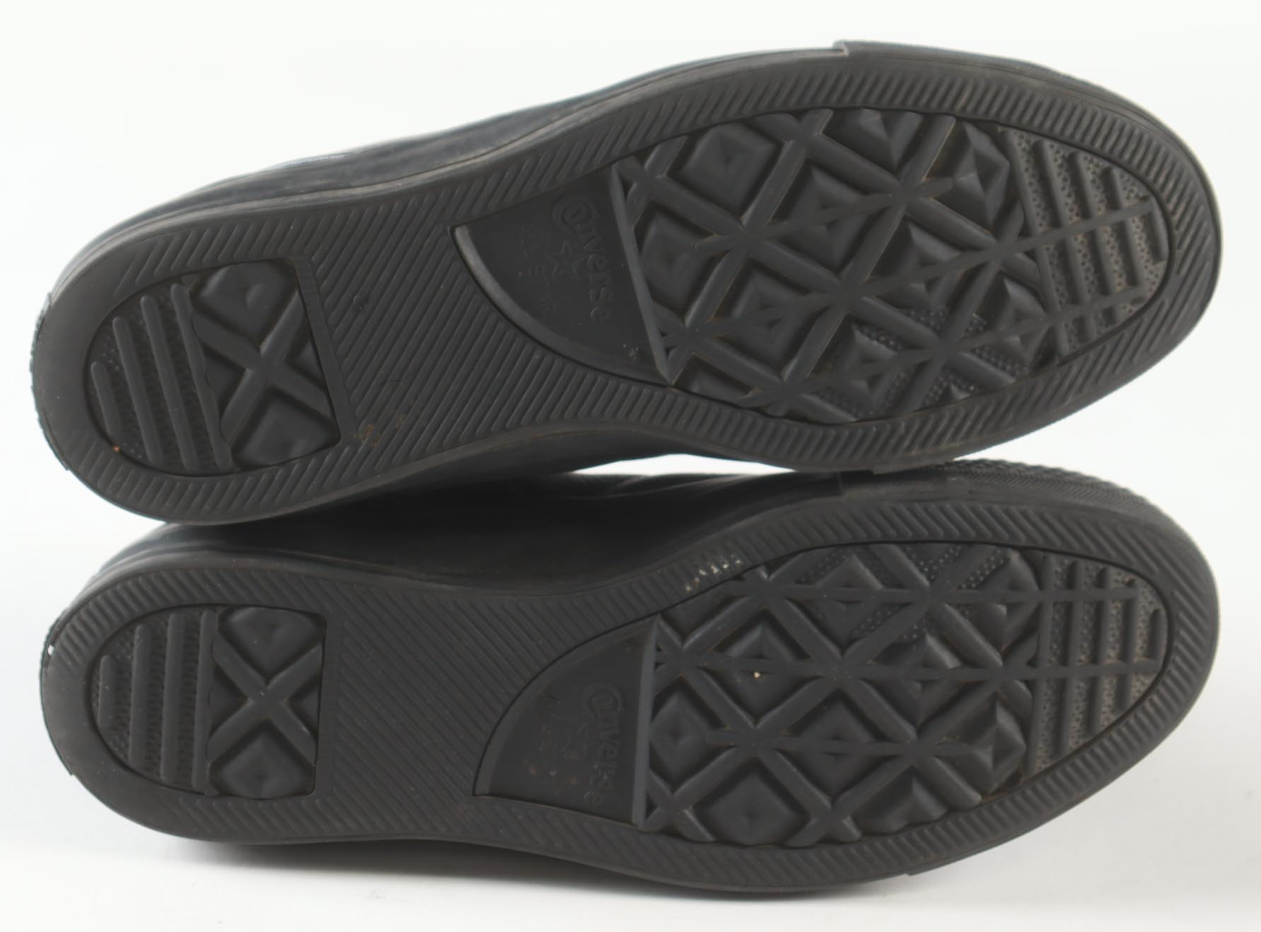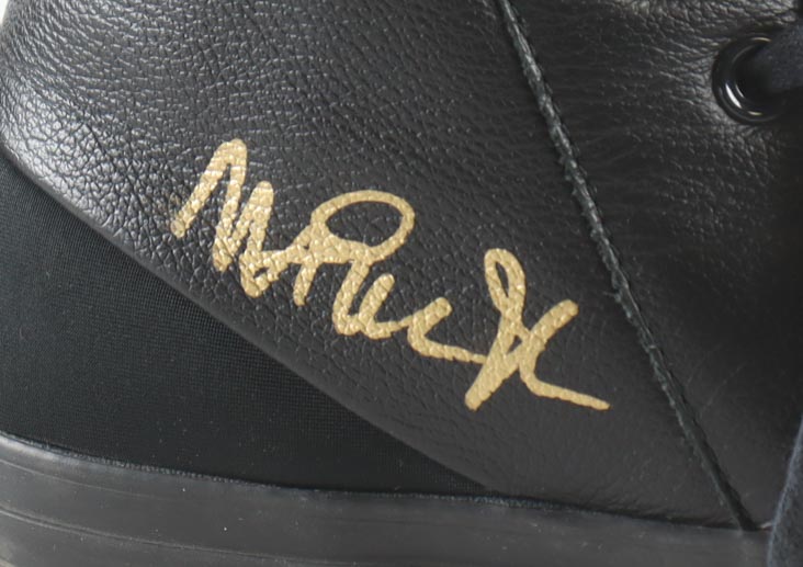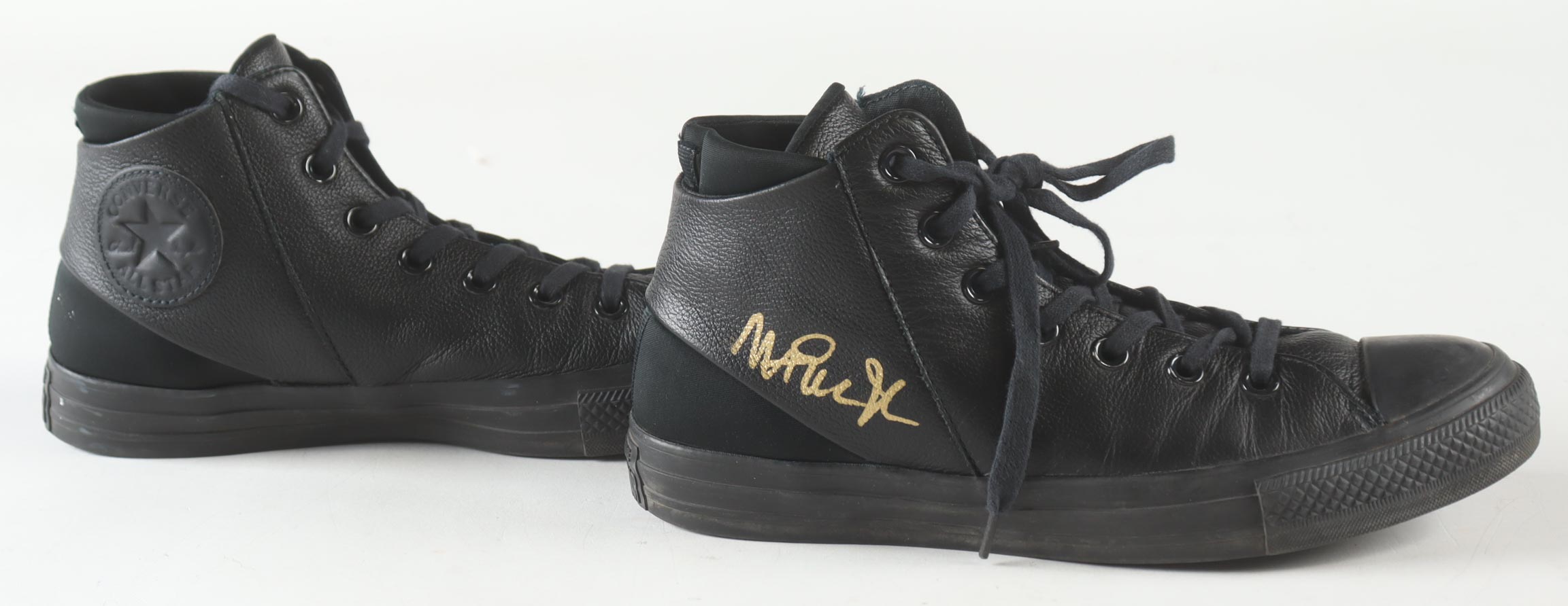 Pair of Converse All-Star Black Leather basketball shoes. Hand-signed by Magic Johnson (Los Angeles Lakers, HOF) and Larry Bird (Boston Celtics, HOF). Display case is included, as shown.