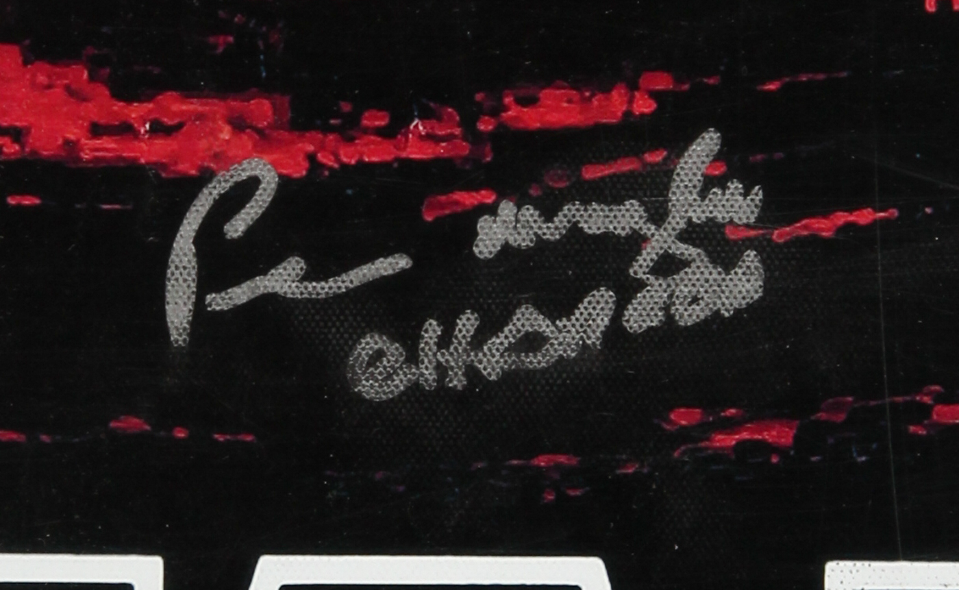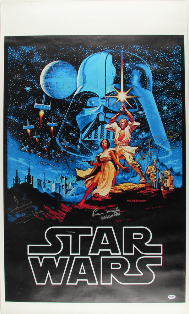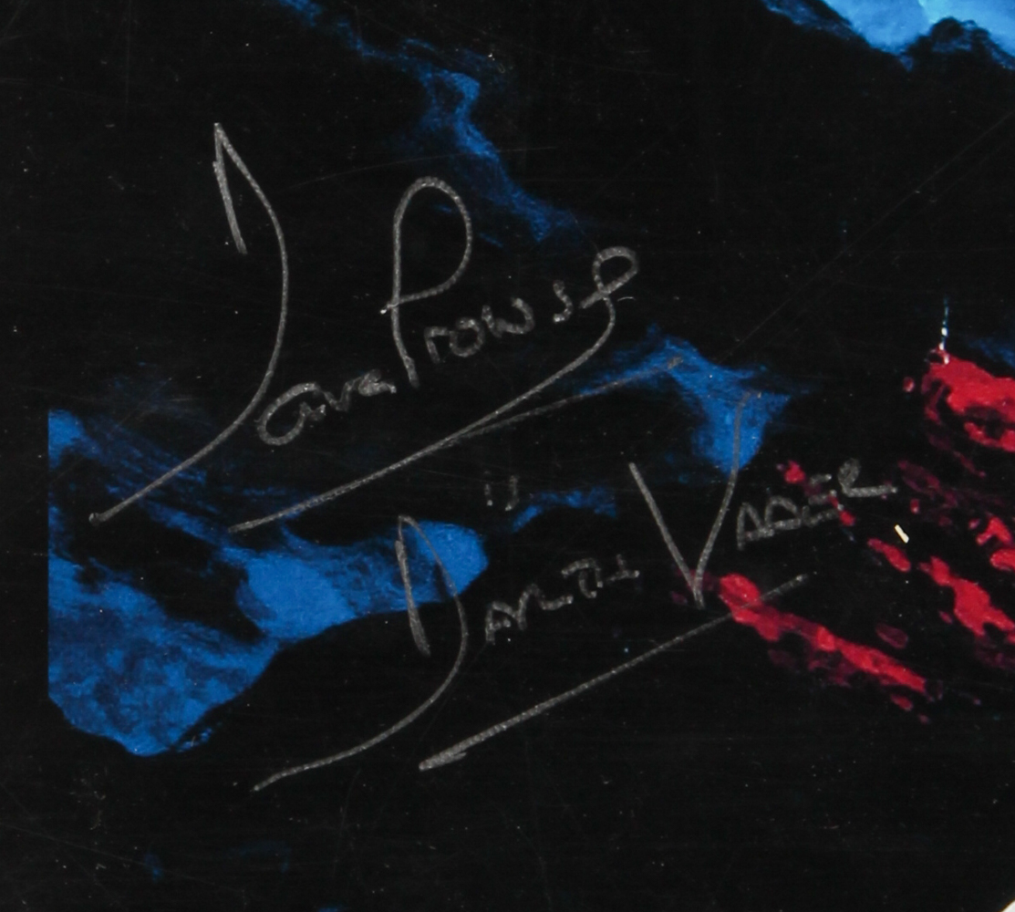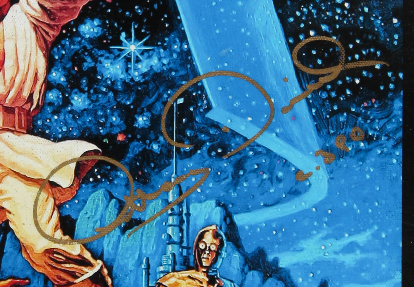 Canvas measures 24" x 41" and has been hand-signed and inscribed by David Prowse (Darth Vader), Anthony Daniels (C-3PO), and Peter Mayhew (Chewbacca).