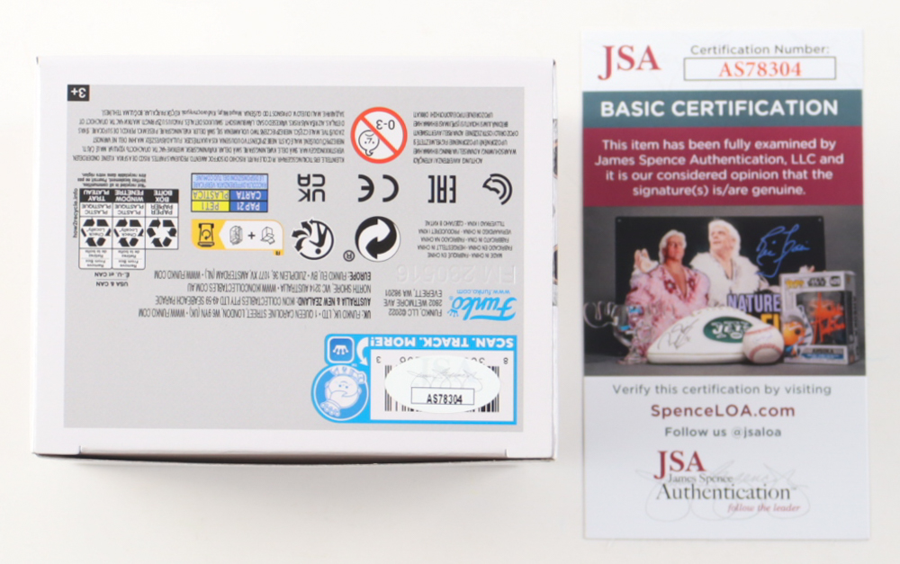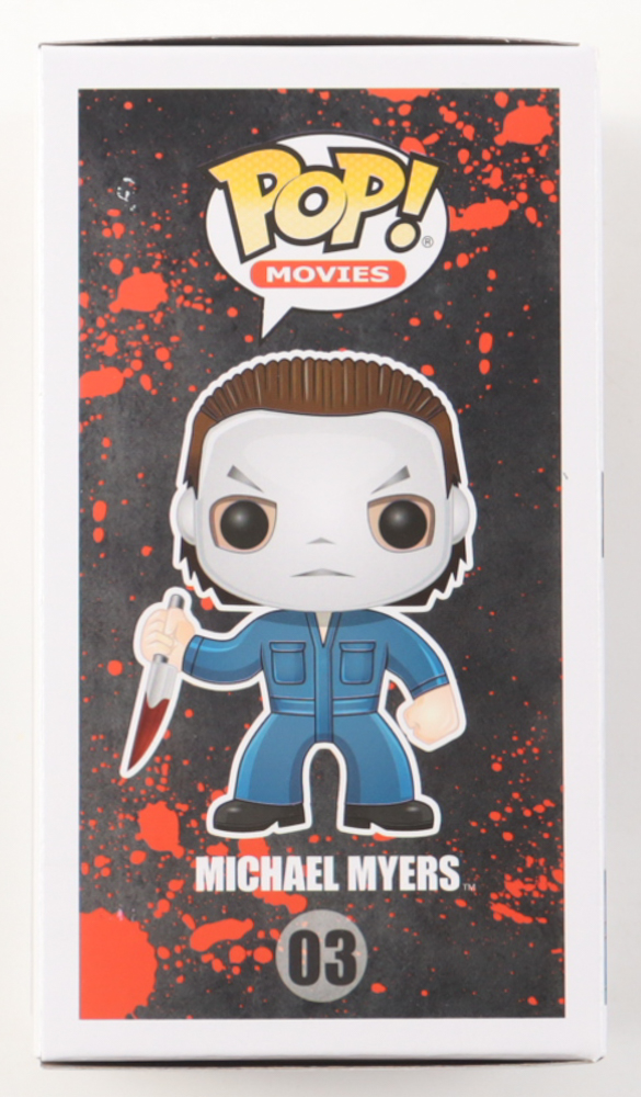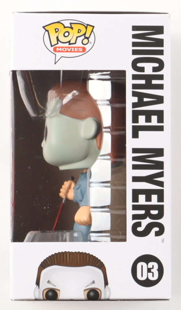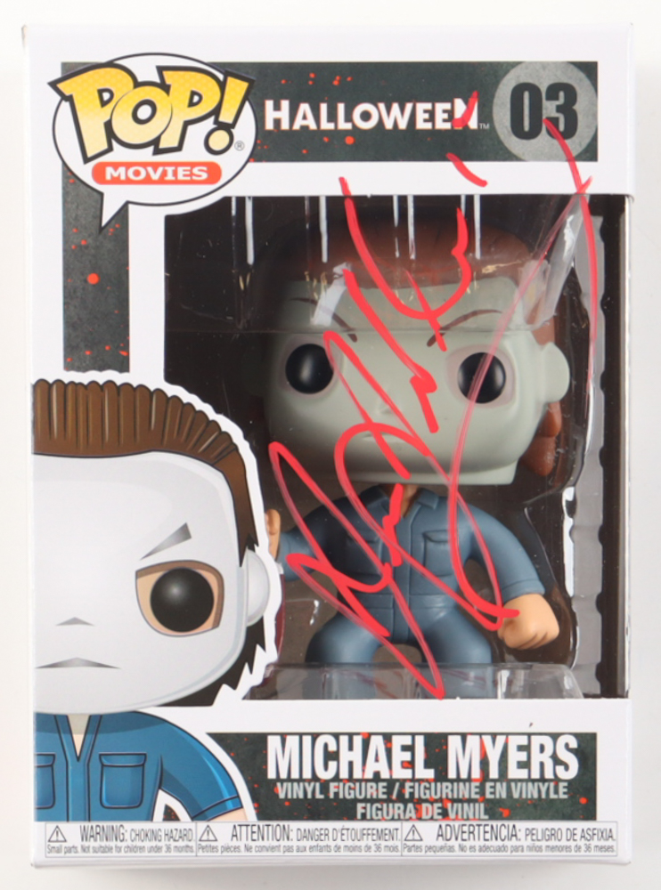 Funko Pop! vinyl figure measures approximately 4" tall and has been hand-signed on the packaging by James Jude Courtney (Michael Myers). Please note, minor tear on the top left corner.