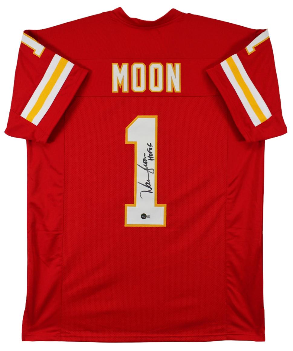 Custom jersey is size XL, everything is sewn on, and has been hand-signed and inscribed by Warren Moon.
