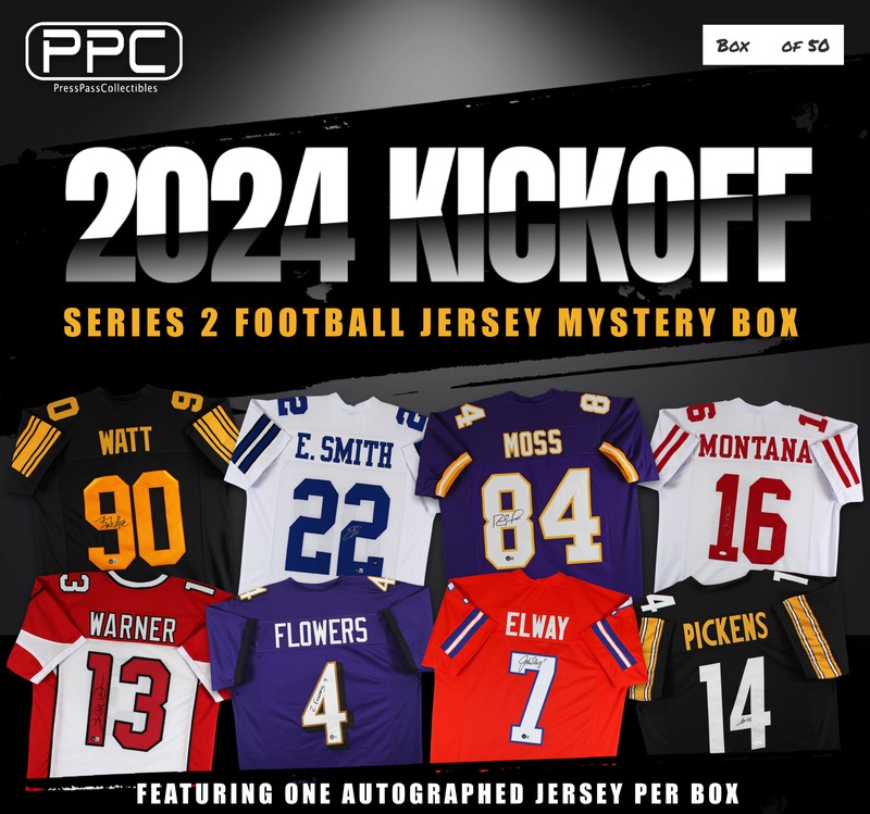 The Press Pass Collectibles 2024 kickoff football jersey mystery box includes one (1) custom jersey from your favorite NFL teams. Some boxes will feature jerseys signed by Kurt Warner, Zay Flowers, John Elway, George Pickens, and many more Stars / Hall of Famers!