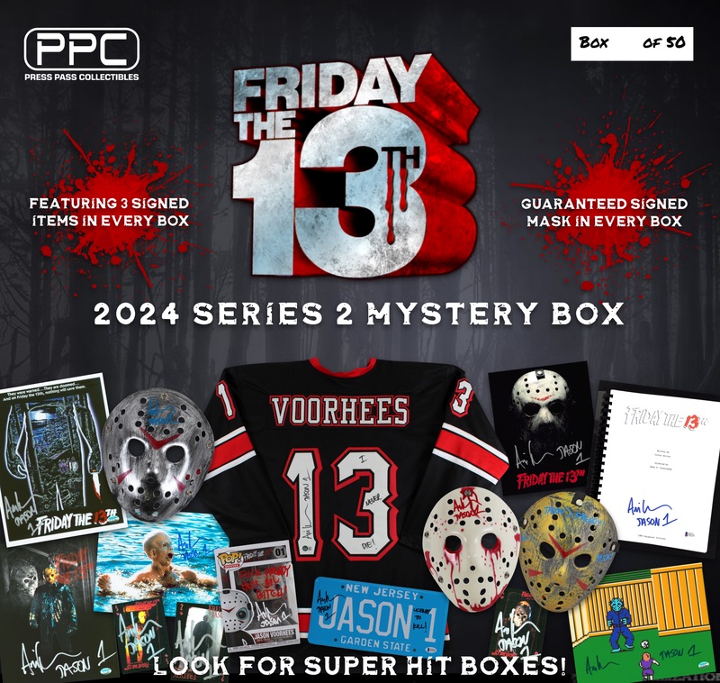 The Press Pass Collectibles 2024 ""Friday the 13th"" Ari Lehman Mystery Box is limited to 50 boxes. Each box will include three (3) autographed items. Each box is guaranteed to have one (1) autographed 8x10 and one (1) signed Jason mask. The last item in each box will contain a combination of autographed jerseys, funko pops, playing cards, license plates, & movie scripts. This is a perfect gift for Friday the 13th fans or all who love horror!