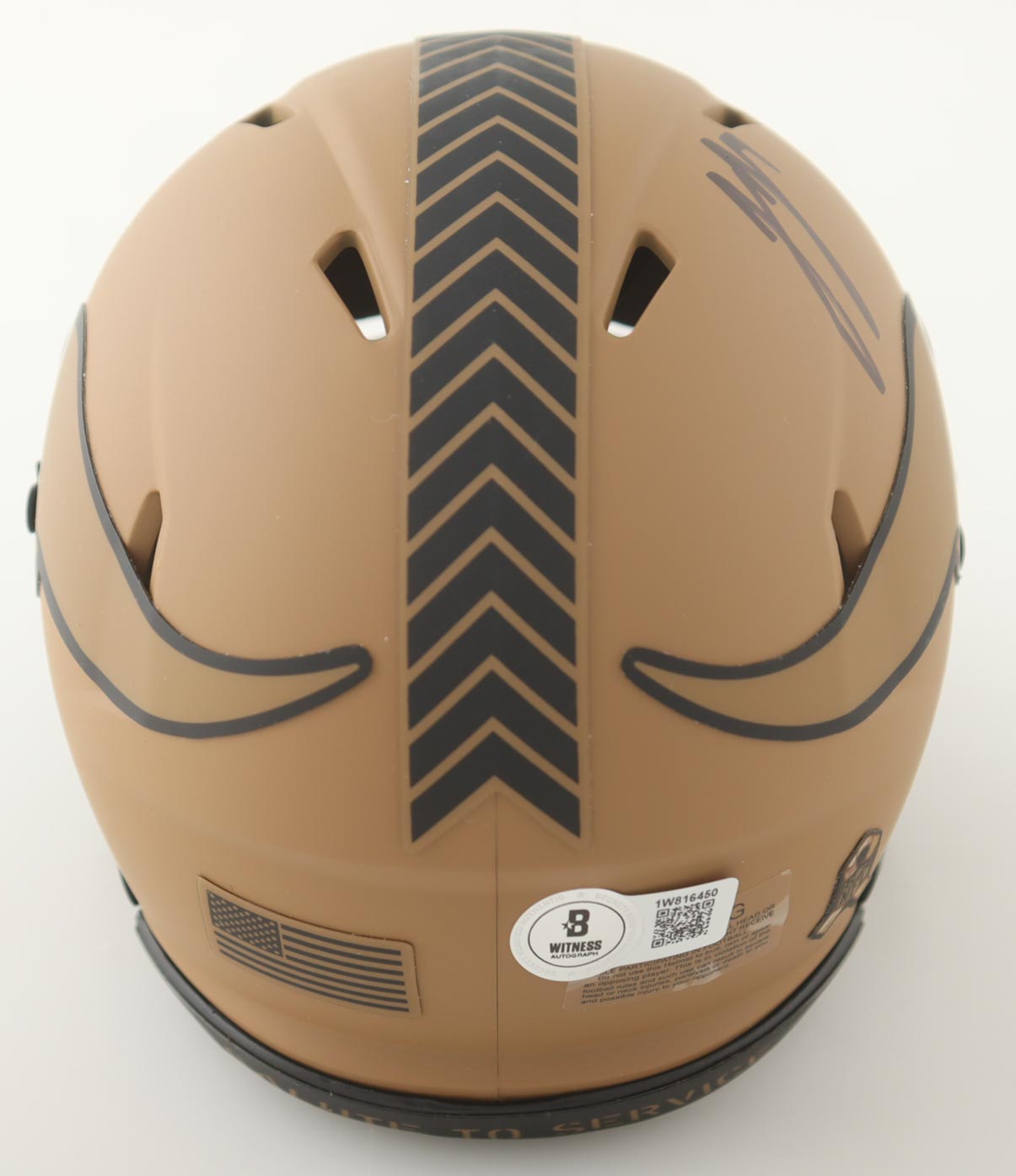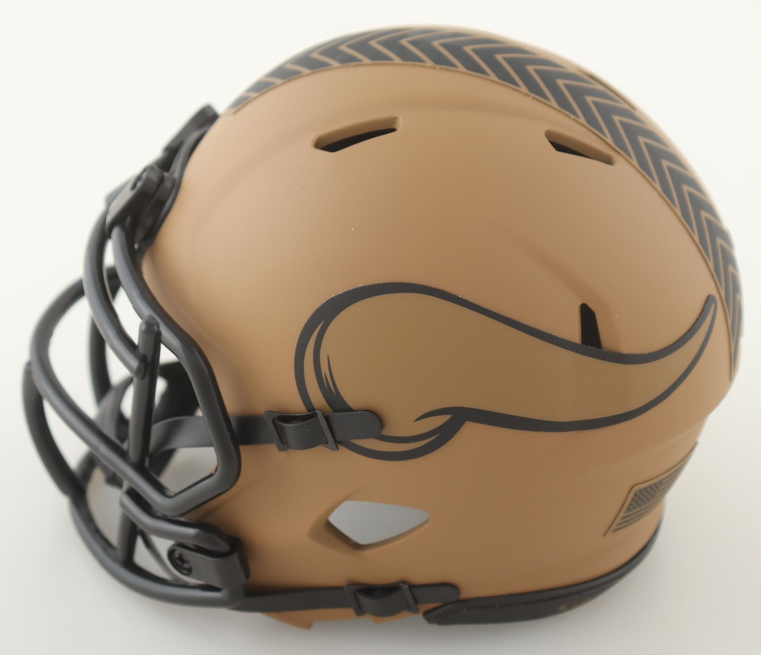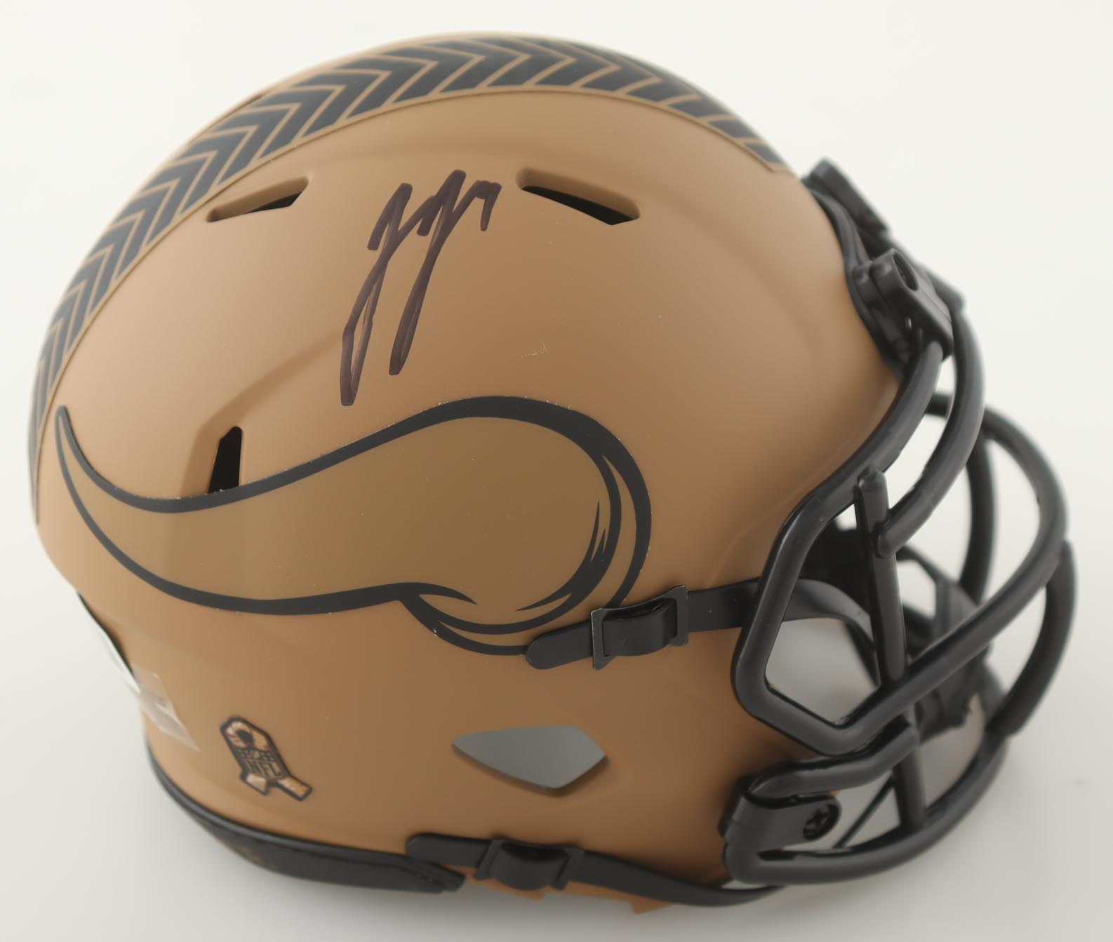 Riddell Minnesota Vikings Salute To Service Alternate speed mini helmet. Hand-signed by J.J. McCarthy.
