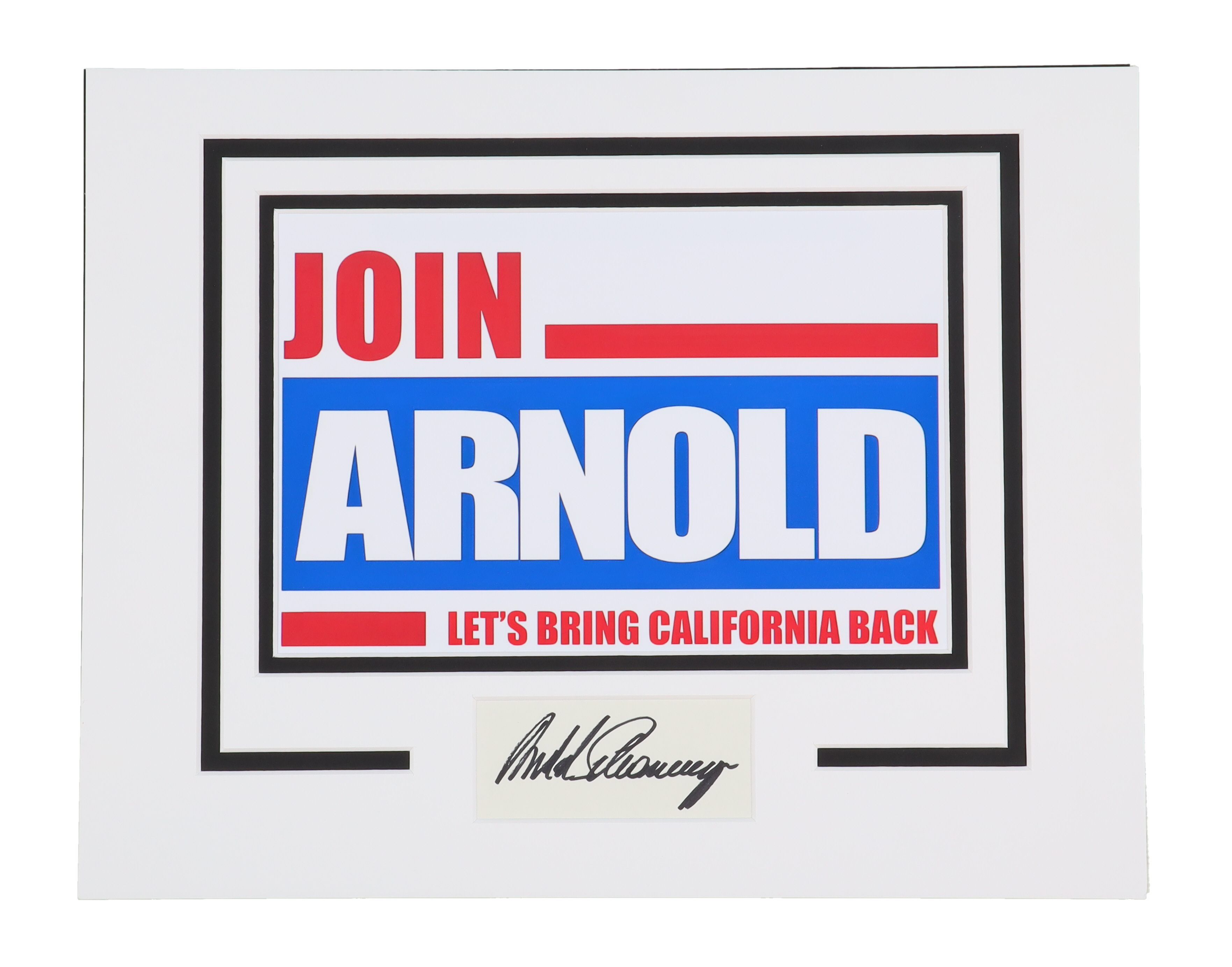 Matted display measures approximately 11" x 14" in size. Features a cut that has been hand-signed by Arnold Schwarzenegger.