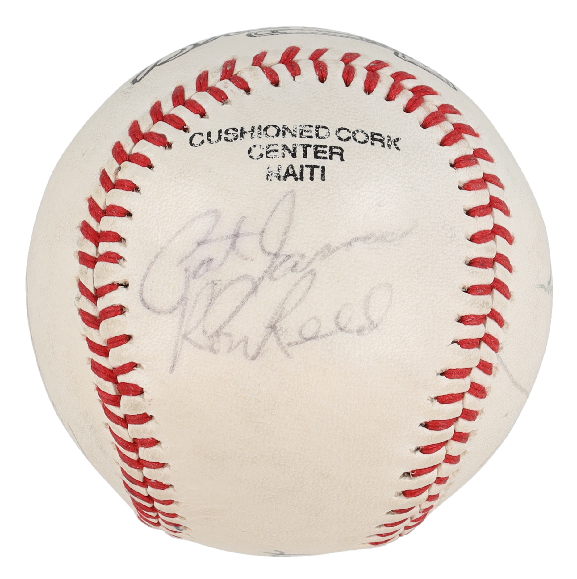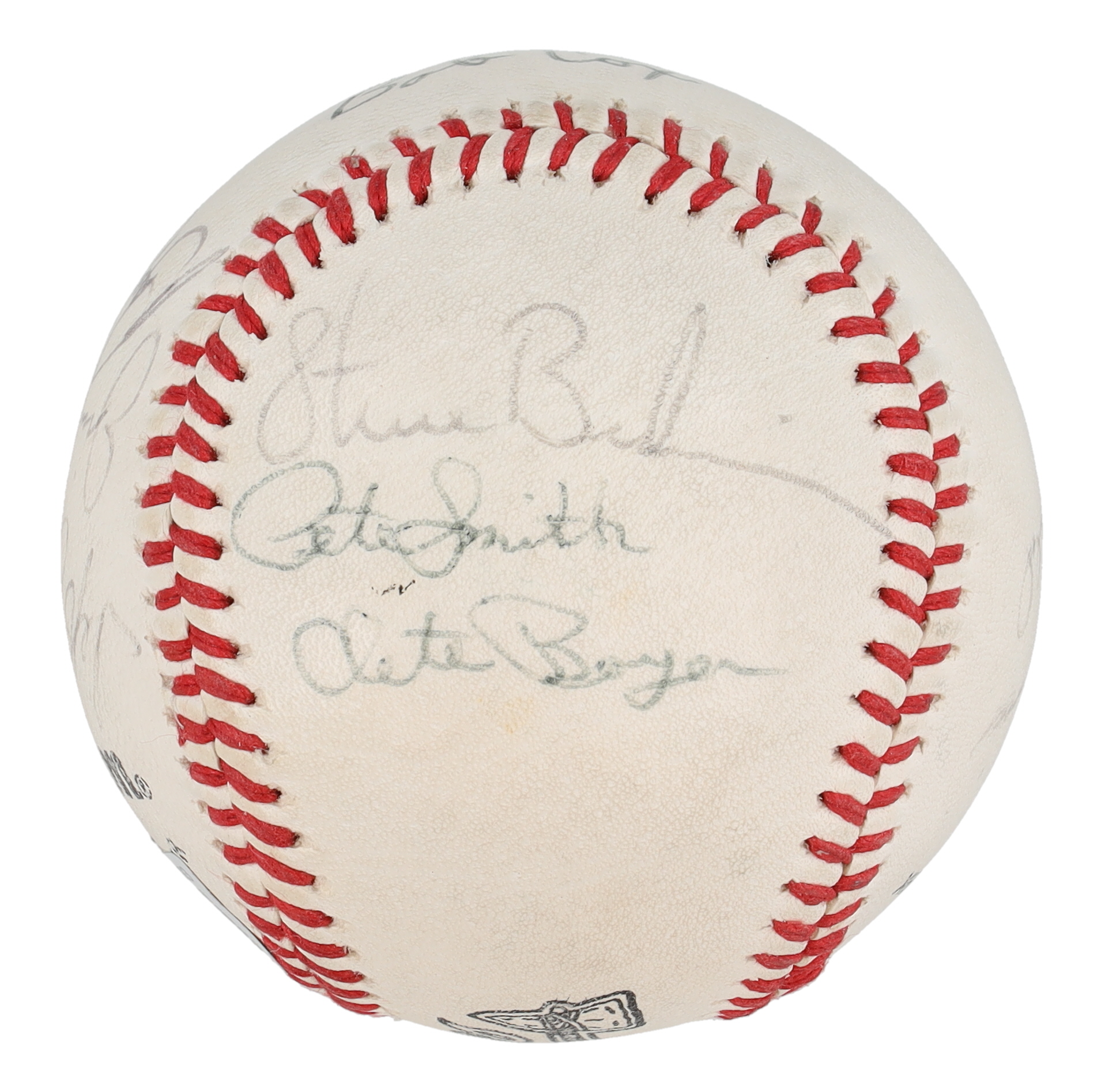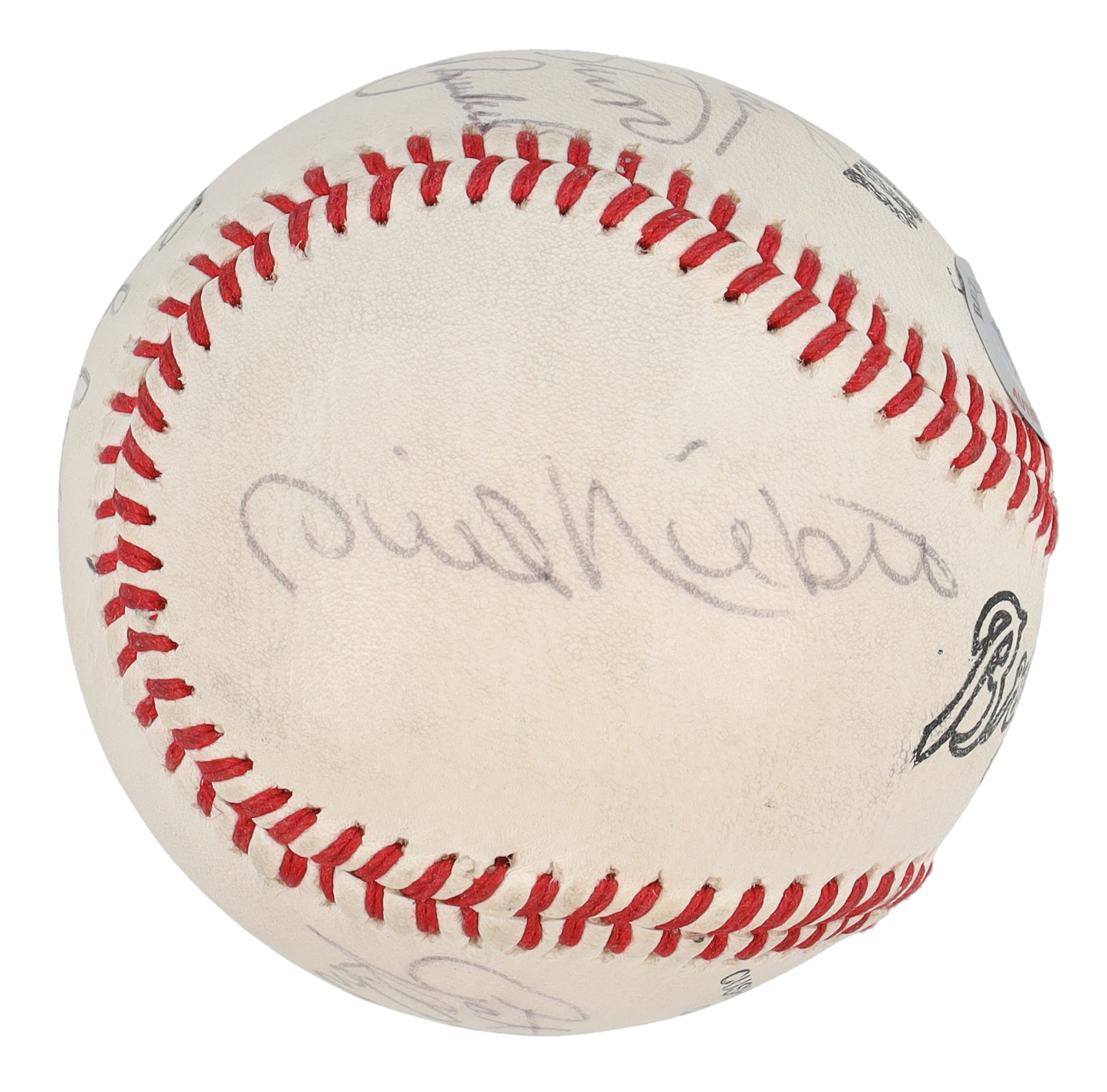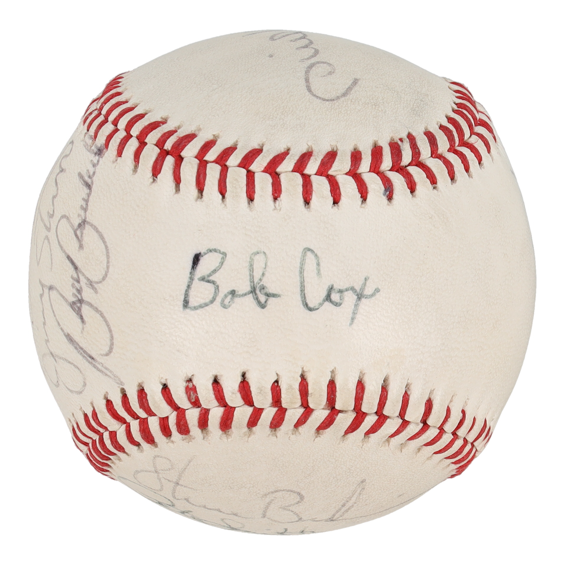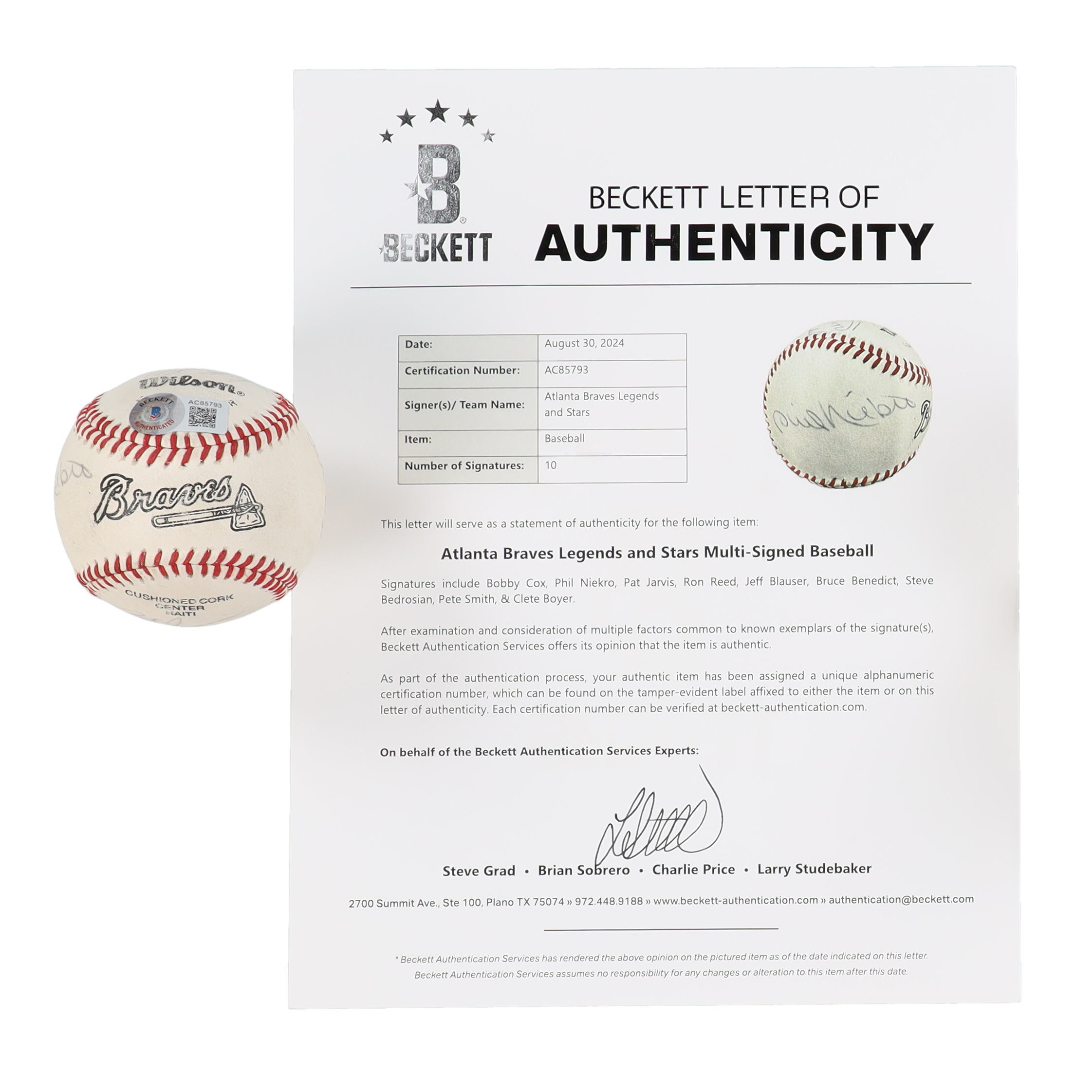 Wilson Atlanta Braves logo baseball has been hand-signed by (10) including Bobby Cox, Phil Niekro, Pat Jarvis, Ron Reed, Jeff Blauser, Bruce Benedict, Steve Bedrosian, Pete Smith and Clete Boyer.